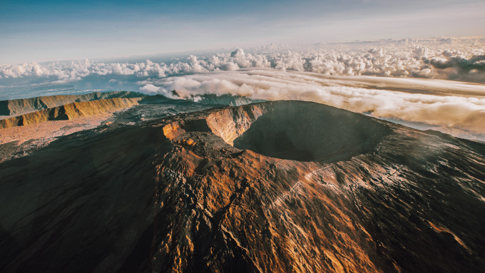 不过,最兴奋的莫过于环绕富尔奈斯Piton de la Fournaise大火山口飞行,这是一个徒步也很难到达的地方。因为这里时常云雾缭绕,能在直升机上清晰地看到如此大的火山坑和每一条清晰的纹路,实在是让人惊叹不已。值得一提的是,富尔奈斯火山还是世界上最活跃的活火山之一,已经有至少53万年的“活动史”,上一次喷发是三年前。大坑旁还有一些小坑依附在旁边,如此的奇妙景象让我们以为脚下的那片土地就是月球。