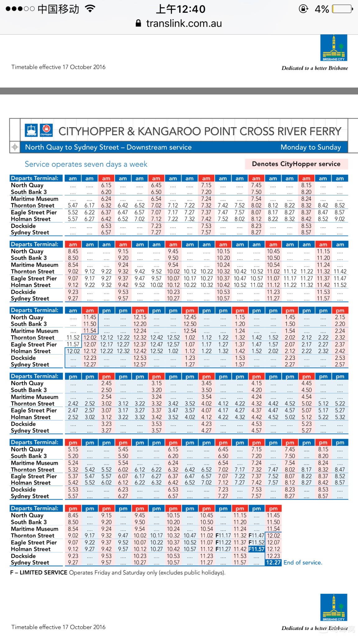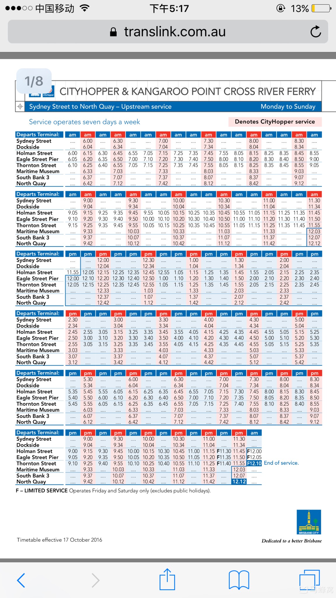 下图红色段行程的是免费,船身也是红色。从东到西停八个码头,从Snydey Street 到North Quay 。我们从eagle street pier坐三站到South bank3去南岸公园玩水。