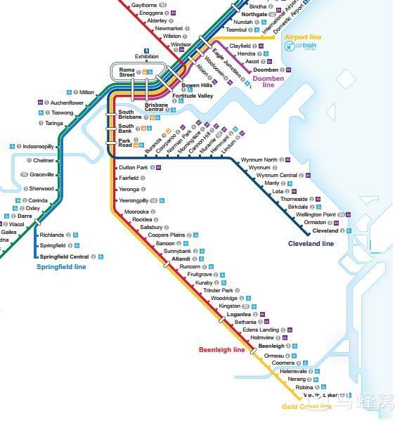 下图为布里斯班火车线路图,机场可以坐黄色线直接到黄金海岸。我们回来从布市机场去凯恩斯时也是坐的黄色线