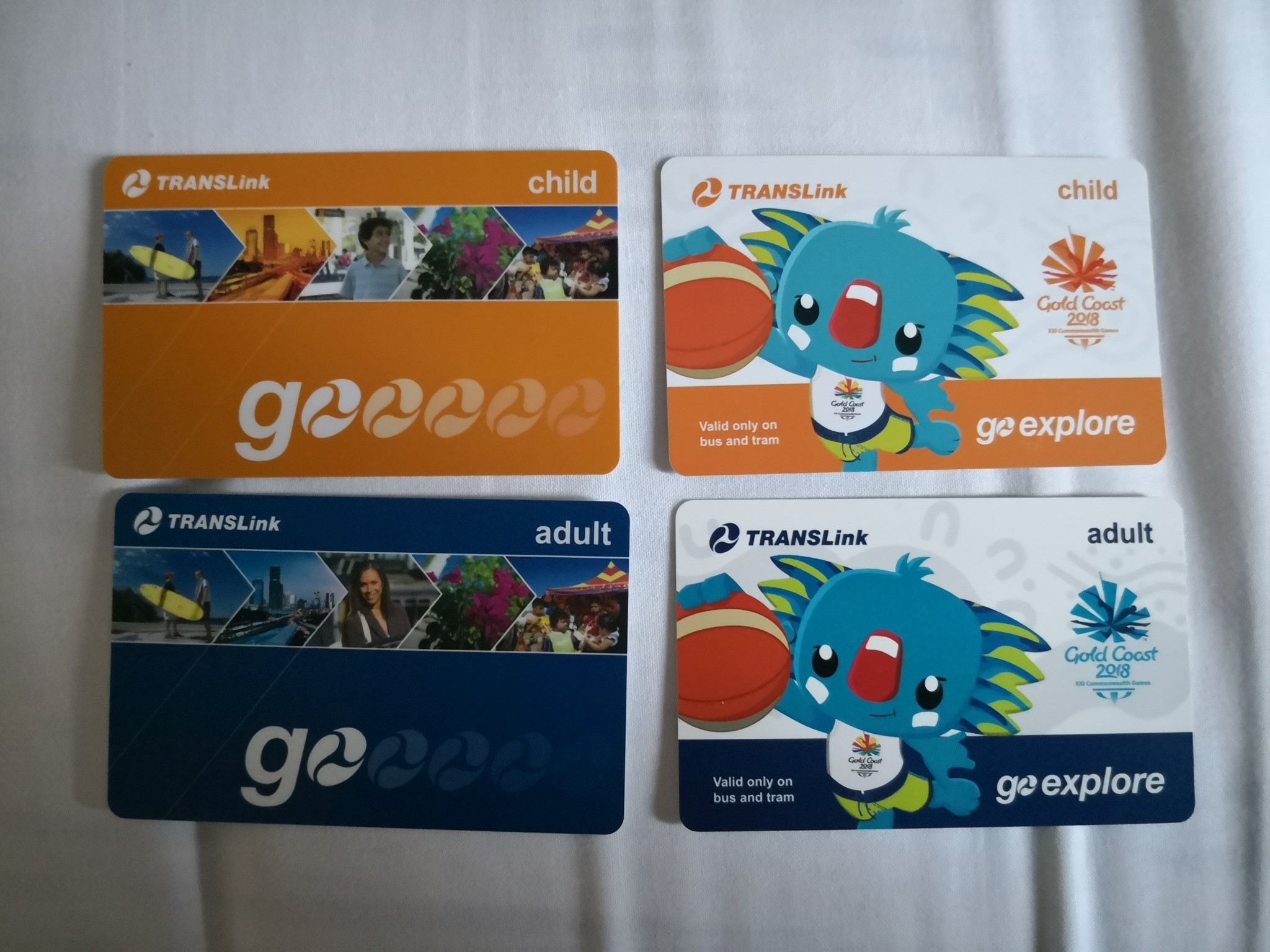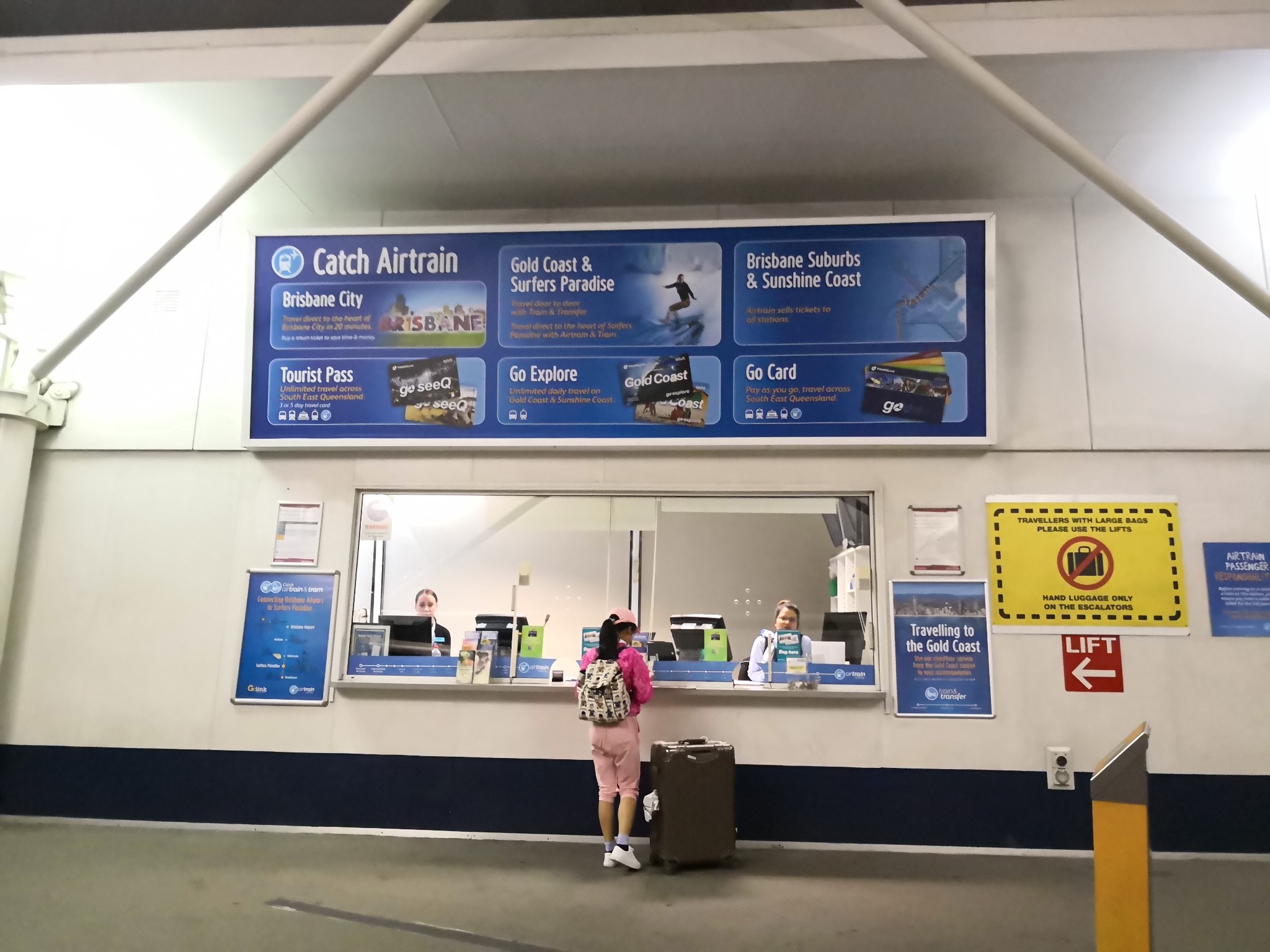 在布里斯班机场三楼顺利找到Airtrain 。售票员很耐心的询问我们行程,然后给了最适合的买交通卡的方案,根据你在布市呆的时间适当充值。左边是GoCard,大人蓝色押金十元充值二十,十四岁以下小孩黄色,押金五元充值二十五。GoCard用不完可以退充值和押金。在布里斯班市区和机场线用。特别提醒小孩从机场到布里斯班市区坐火车是免费的。但要办一张免费票。黄金海岸专用交通卡Gowxplore,每天大人十元,小孩五元,不限制次数不能退余额,按照你需要的天数进行充值。