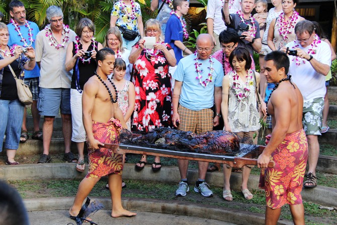 晚上吃了夏威夷最出名的鲁奥大餐—阿里鲁奥大餐,结果证明果然是名气远远大于实质,烤猪很一般,其他更是没什么东西,好像总共只有4个热菜,4个凉菜,太惨了。只不过可能是要的一种夏威夷鲁奥大餐的氛围,在吃饭的时候一直有人表演节目。不过当主持人问大家“How’s the food?”时,下面应声的人聊聊无几,要知道美国 人不像中国人一样含蓄,非常喜欢说话,但是都没什么人说话,可想而知饭到底怎么样了,呵呵。