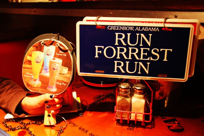 店里阿甘的著名乒乓球拍,还有写着电影中著名台词的牌子。