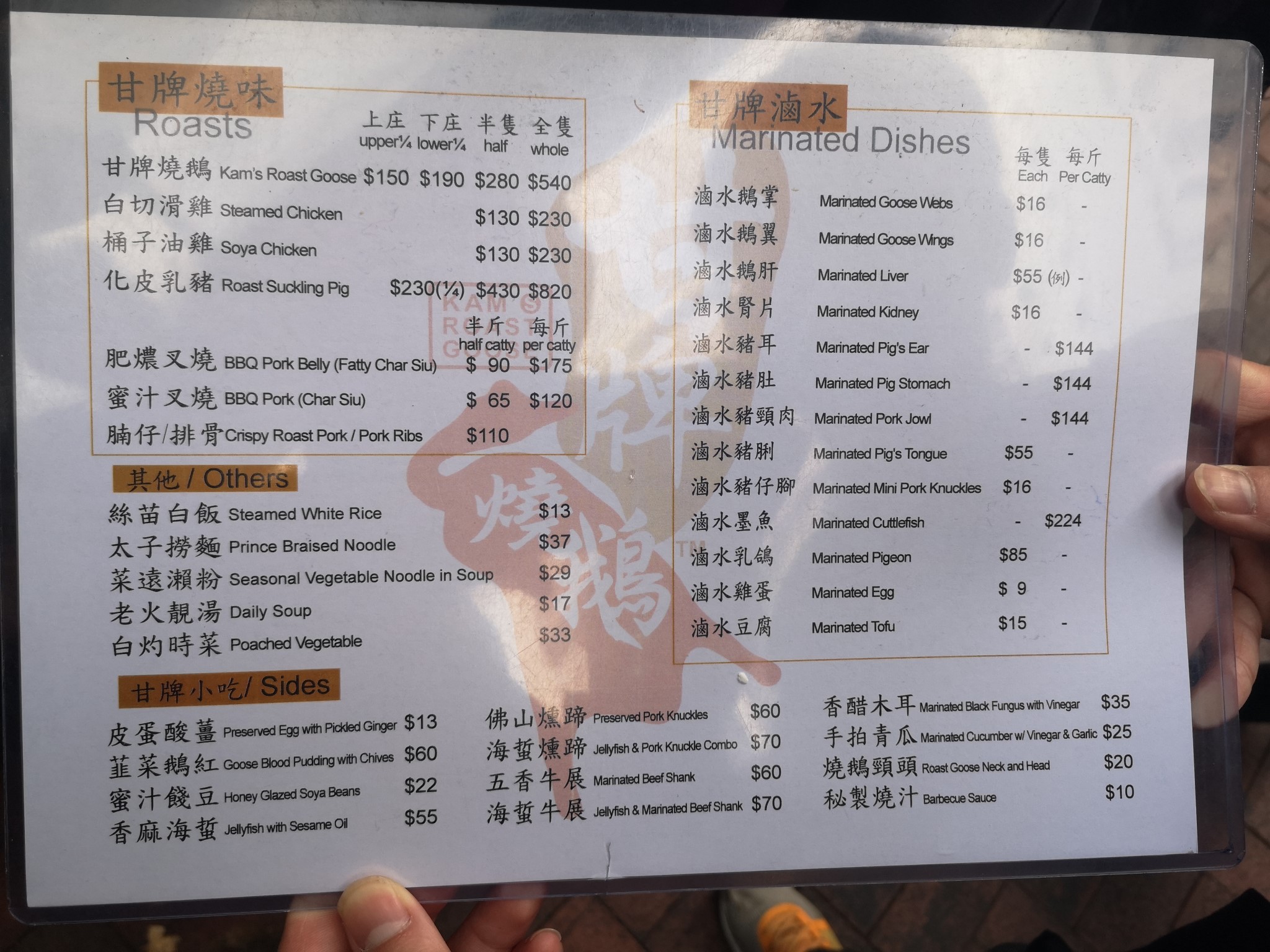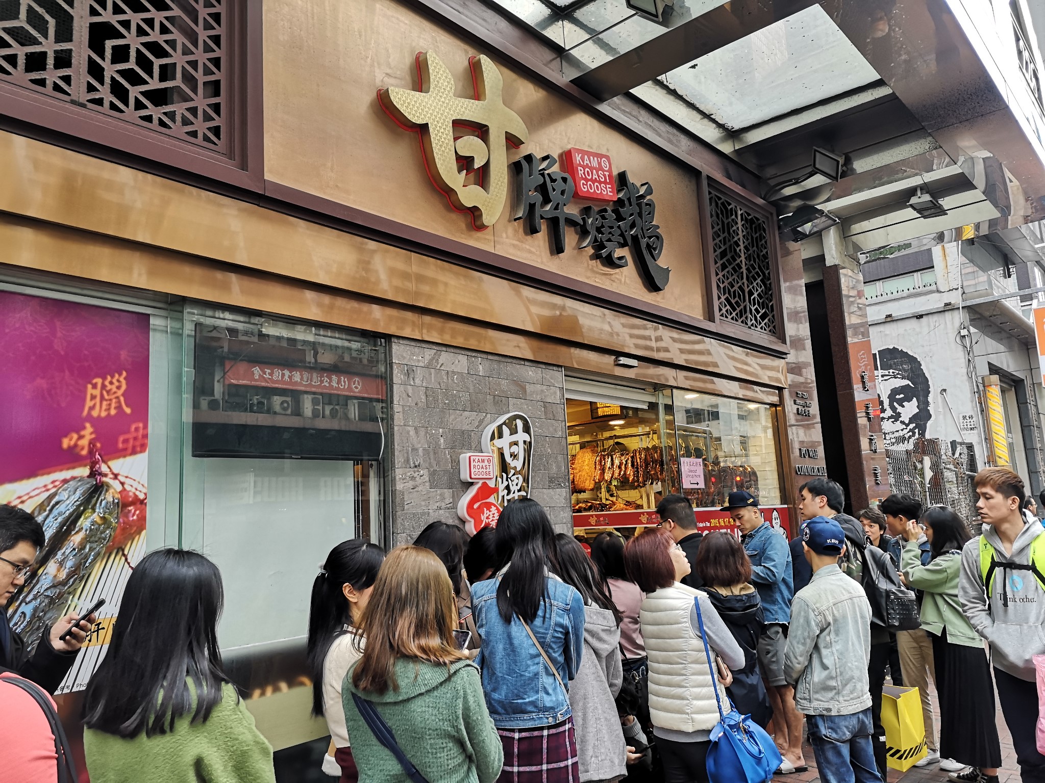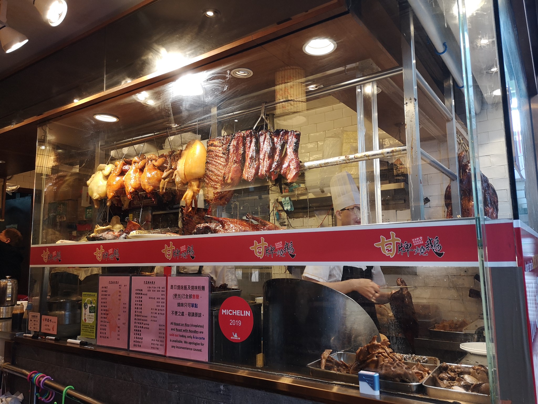 成功打卡第一个点后,我们无暇顾及时代广场的繁华,继续步行前往香港烧鹅榜第一位、米其林一星的“甘牌烧鹅”,本来烧鹅在广州也是蛮有名气,但香港的烧鹅也是来头不小,因此引起了我们的好奇心。据说烧鹅分为脆皮烧鹅和酥皮烧鹅,后者制作时使用湿性的酱汁来腌制,烧鹅烹饪完毕后再将肉汁和鹅油淋于烧鹅之上,甘牌烧鹅就属于酥皮类。与“池记”一样的人潮,门口准备打卡的食客已经有20多人,拿了号,我老老实实在那等,太太和小孩也放心地去逛街了,预计一时半刻也不会轮到我们。闲着没事,我也在手机里研究起米其林的评级规则,学习后才恍然大悟知道能够拿到一星也是十分不容易,也是很有特色很值得一试的餐厅。发号的是一位精明干练的大姐,国语、粤语或者英文都可以沟通,很容易与食客打成一片,以此等待中也不会太闷。一个小时的排队,终于轮到我们了。我们点菜的量不多,下庄的烧鹅和一份叉烧,毕竟我们还要留力继续打卡。烧鹅咬下去的感觉是皮脆肉香,汁水很足。更为惊人的是叉烧,肉质紧实又不失松软,小孩大加赞赏,甚至觉得比烧鹅还好吃。