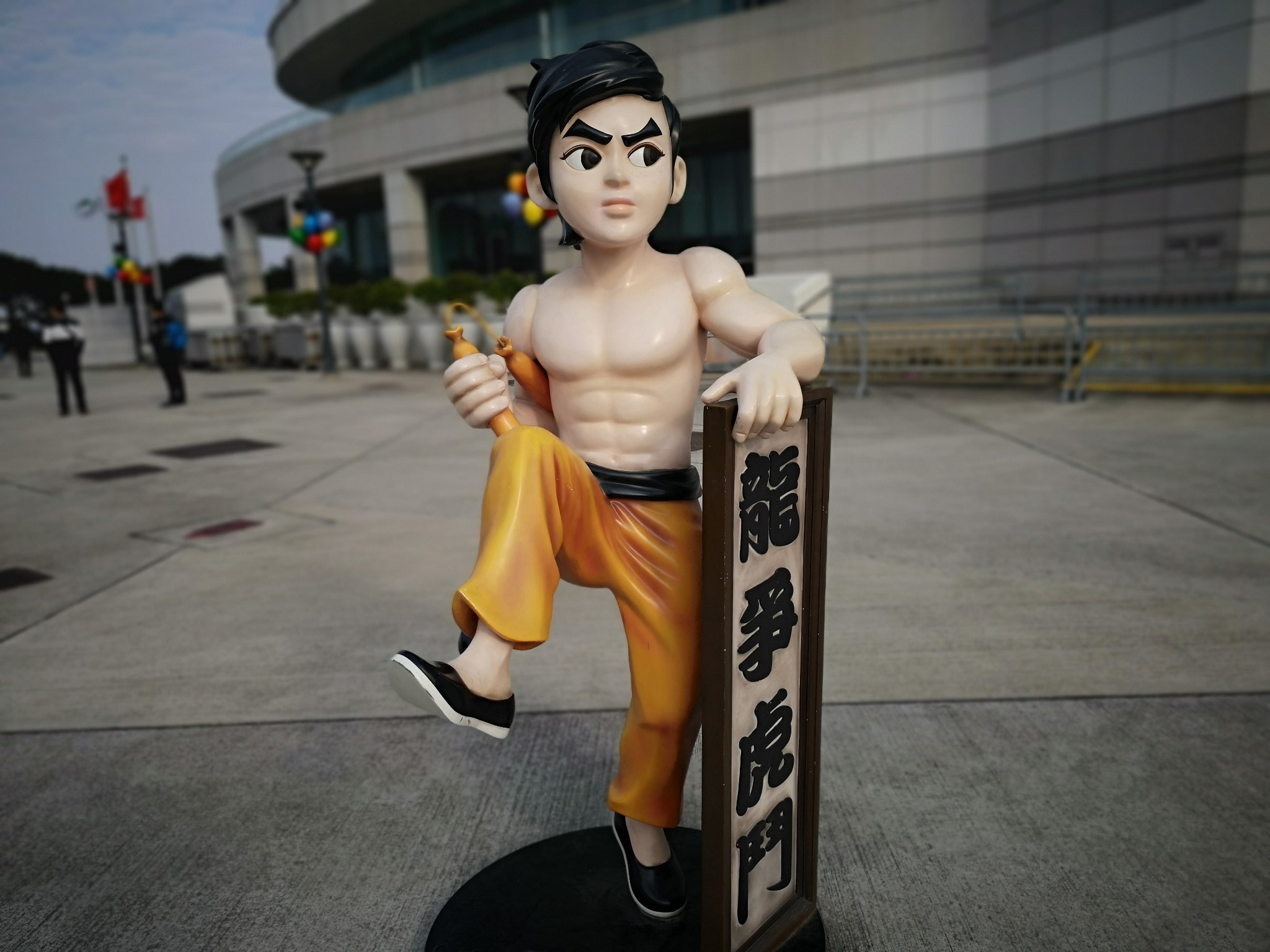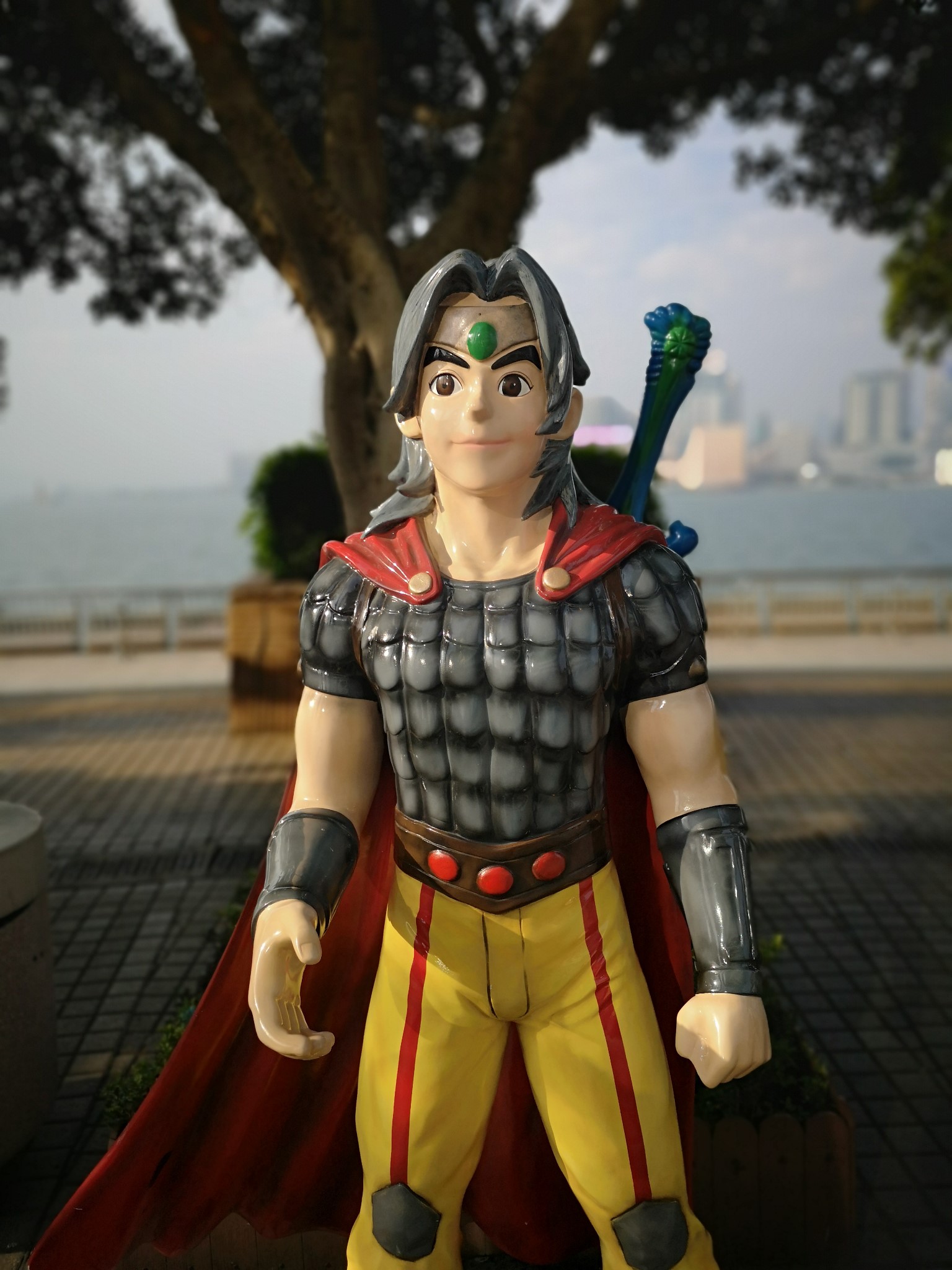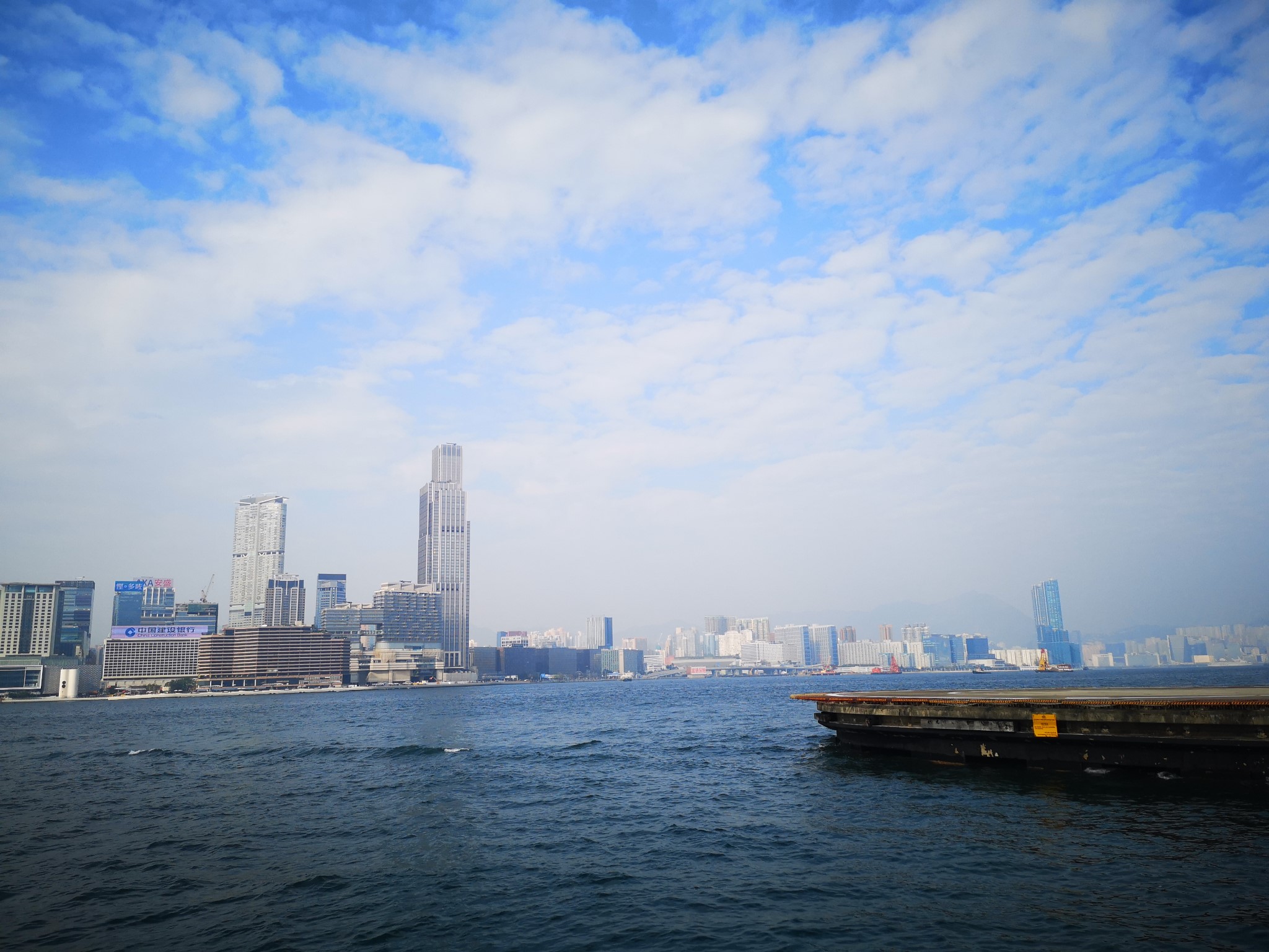 饱餐之后,我们步行前往香港回归标志性地点---金紫荆广场和会展中心。海边正在做围蔽施工,费了不少劲才来到了维多利亚港前。阳光恰如其分地洒在水面上,习习凉风吹拂下波光粼粼,蓝蓝的天空作为背景将对岸高楼映衬地格外靓丽。矗立的金紫荆让人仿佛回到了1997年回归的一幕,会展中心更多让人想起了成龙主演《新警察故事》中那拼命的场景。顺着广场漫步,可以看到许多香港著名电影人物的卡通形象,游客可以模仿动作一起合拍。香港的电影文化对我们成长的影响是十分巨大的,不论是早期的李小龙、老夫子,还是近期的聂风、步惊云,都是那么熟悉和惊喜。小孩知道的不多,但作为70后的我们,这些在精神物质匮乏的年代伴随着成长的外部要素都是记忆犹新。