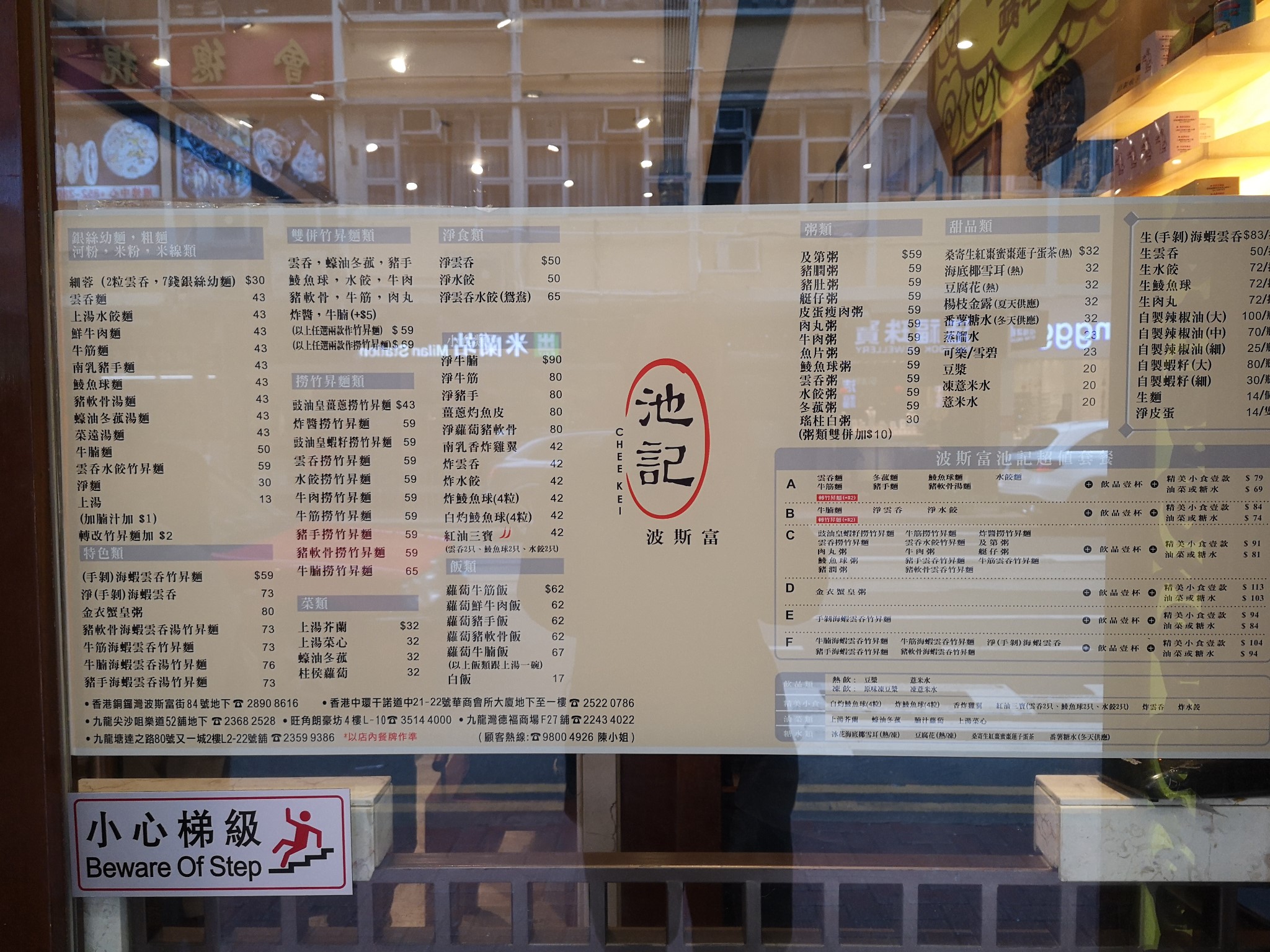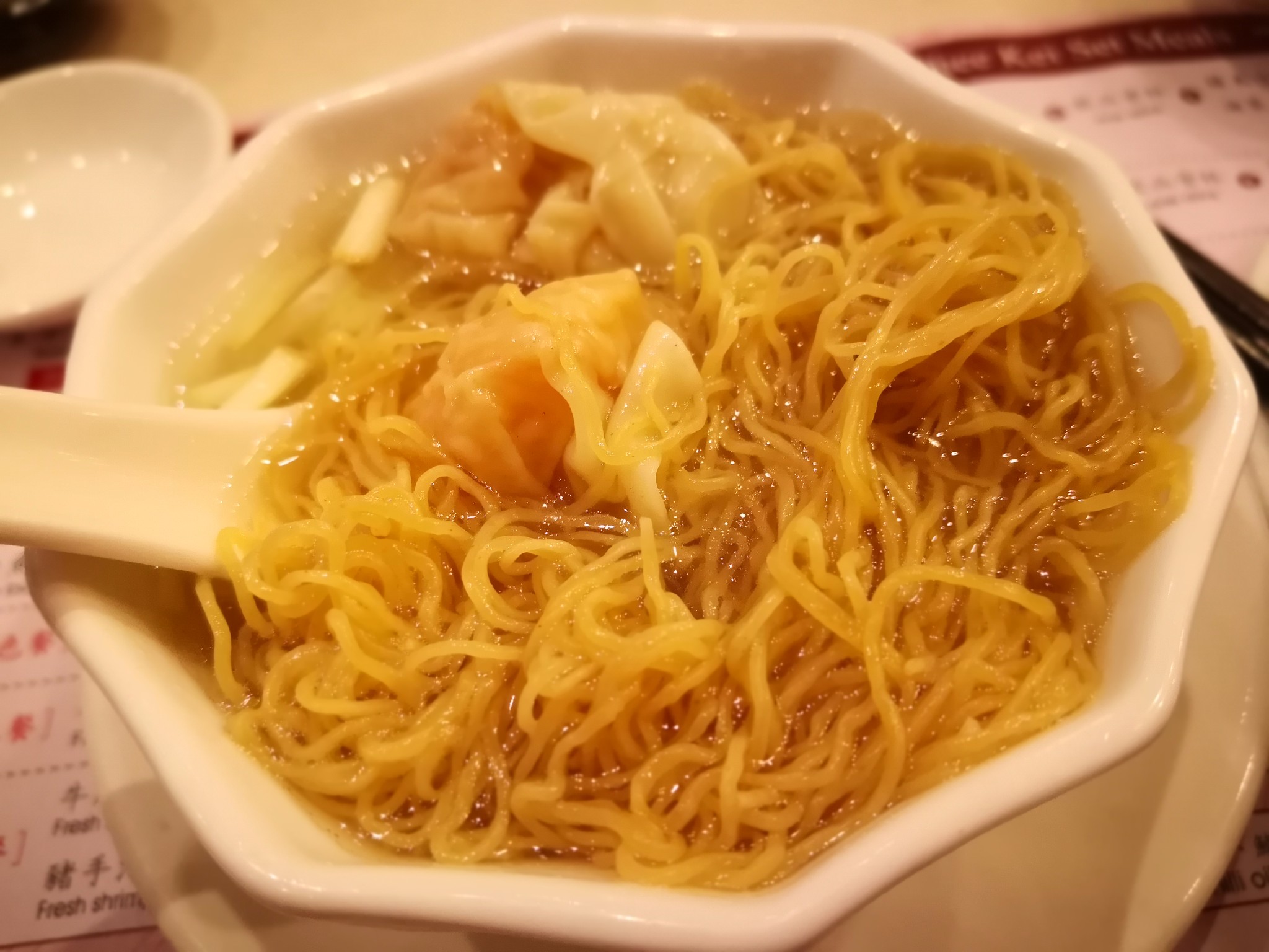前往铜锣湾就是为了觅食,“池记”是我们打卡的第一个点,想要吃到正宗港式细蓉面,近时代广场的“池记”是必须要去的。地铁站出来步行3分钟左右,“池记”显眼的招牌就出现在我们面前。果然不出所料,门口站满了慕名而来的食客,一位中年的阿姨熟练地进行指挥,并根据店内的食客情况,有序地安排焦急的食客进入堂食。香港餐厅铺面普遍不大,拼桌是必不可少,三天行程里,我们与香港人、内地人、韩国人都一起共桌过。池记的细蓉、云吞面是我们的首选,很快,食品上桌,饥肠辘辘的我们迫不及待品鲜,总体感觉是全蛋银丝细面十分弹牙,云吞皮细薄如纸,鲜猪后腿肉和鲜虾仁和成的云吞馅让人回味无穷,汤底鲜香醇厚,忍不住要喝个片甲不留。“池记”结账时港币和人民币均可使用,让人倍感亲切。在香港,港币和人民币大多地方都通用,街上的兑换点也很多,但建议不要在西九龙站兑换,最不划算。