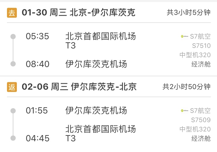 1.机票:S7航空北京-伊尔库茨克飞猪或官网购买 记得提前买行李额(廉航)