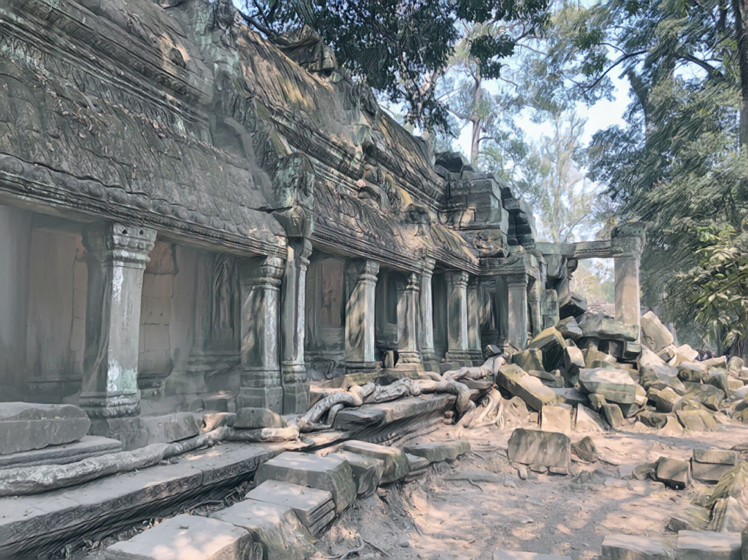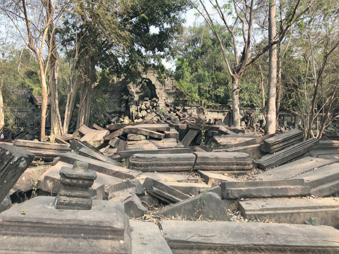 在崩密列寻残垣断壁, 崩密列不属于常规的吴哥景区范围内,所以一般的旅游团行程中很少会包括这个景点,因为确实有些太荒僻,崩密列在废弃的庭院和塔之间,树木草丛茂密地生长着,内部的一些雕刻都反映出佛教特色的主题。但是由于年代久远,建筑的损坏也是较为严重,难以恢复其原样了。寺庙的历史无人知晓,由于损坏留给后人的信息也十分缺乏,只能从建筑特色和风格猜测是12世纪时的建筑物。寺内的杂草丛生,寺庙坍塌,都体现出了一片荒凉的气息,也许正是这个原因,成为了古墓丽影的取景地吧。