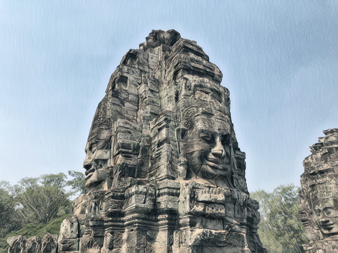 吴哥城里面的巴戎寺中,有四十余座巨大的四面佛雕像,佛像为典型高棉人面容,个个面带笑容,据说是建造巴戎寺的神王阇耶跋摩七世的面容。佛像脸带安详的微笑,这就是令吴哥窟蜚声世界的“高棉的微笑”。