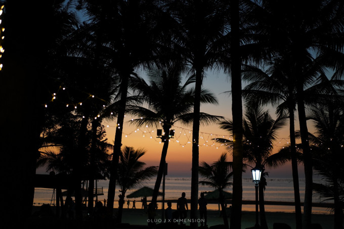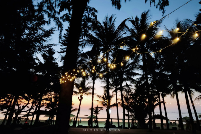 椰树、彩灯、逐渐散去的人群,与天边的红色组成了美好的画面。天成台的日落也不是每天都能看到,刚好我们到的这几天天气很好,云都没有,运气不错。