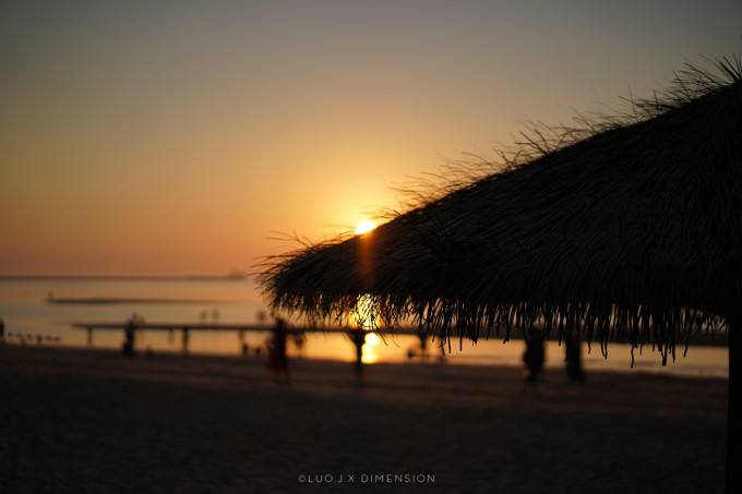 天边没有云,远看一只小船停在海中央,与沙滩上的草棚、躺椅一起衬托日落的美。