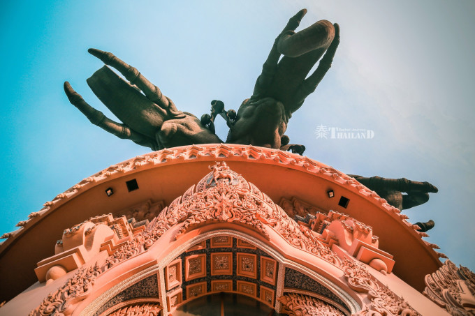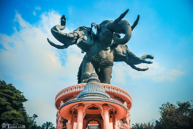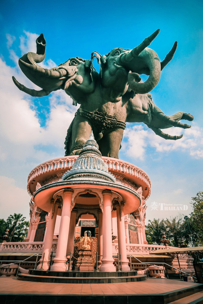 三头象是泰国民间故事中的象神,因象神是婆罗门教中的一位天神的座骑,故此象神通广大,不论什么妖魔鬼怪都不是它的对手。这尊三头神象是由纯铜精雕而成,重达250吨,高约16层楼。