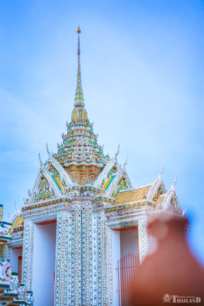 郑王庙最诱人的景色就是那白色的尖塔,高达79米的“拍攀”大佛塔,始建于1842年,属于大乘舍利塔式。尖塔的外面装饰以复杂的雕刻,并镶嵌了各种彩色陶瓷片、玻璃和贝壳等,是泰国规模最大的一座大乘塔,有“泰国埃菲尔铁塔”的美称,令人叹为观止。在其周围尚有四座与之呼应的陪塔,形成了一组庞大、美丽的塔群,其规模在曼谷仅次于大皇宫和玉佛寺。在原来是可以爬上中心“拍攀”塔,但是因为楼梯很陡峭,出于安全考虑,已经封闭不让游人上去了。