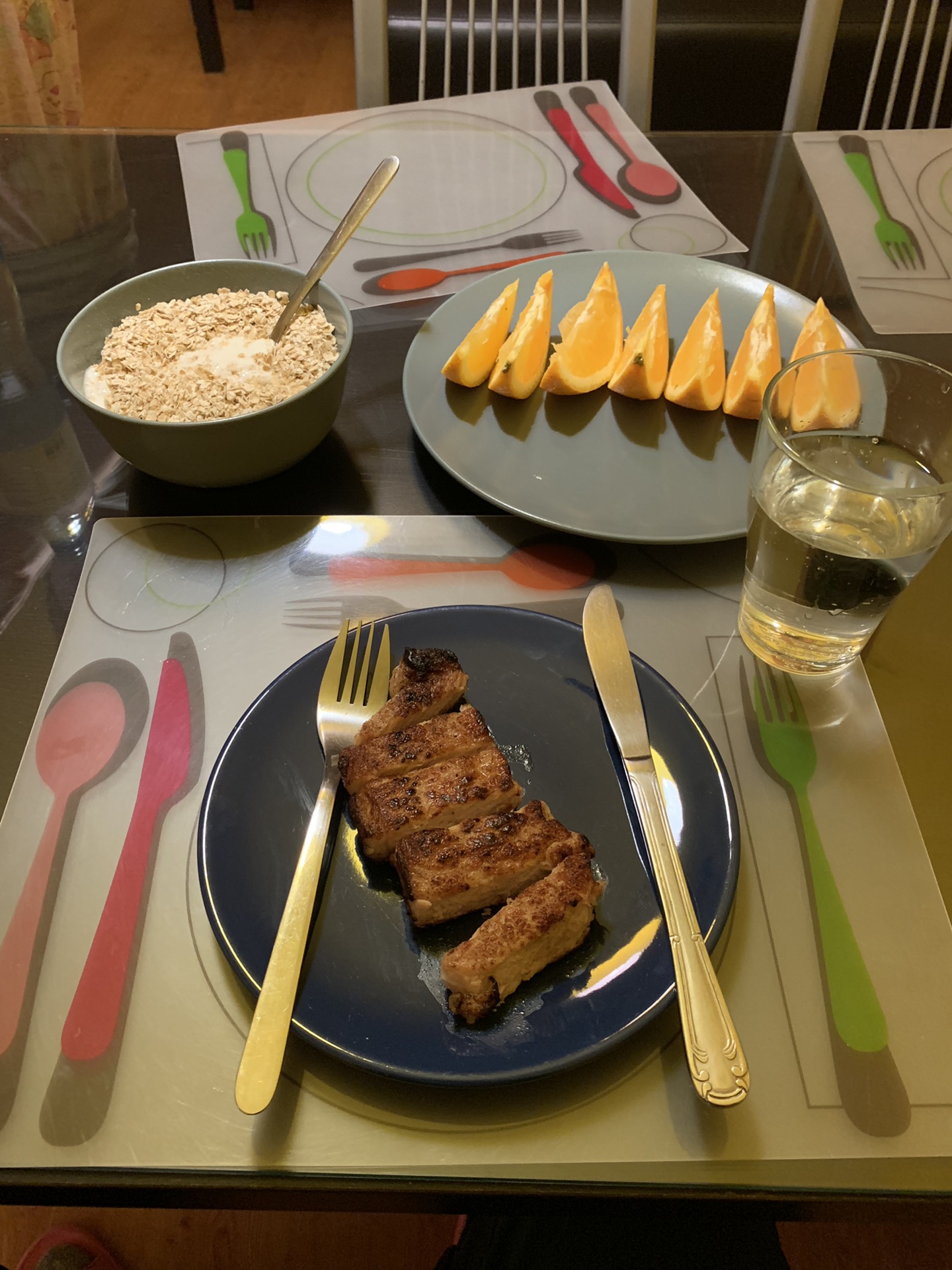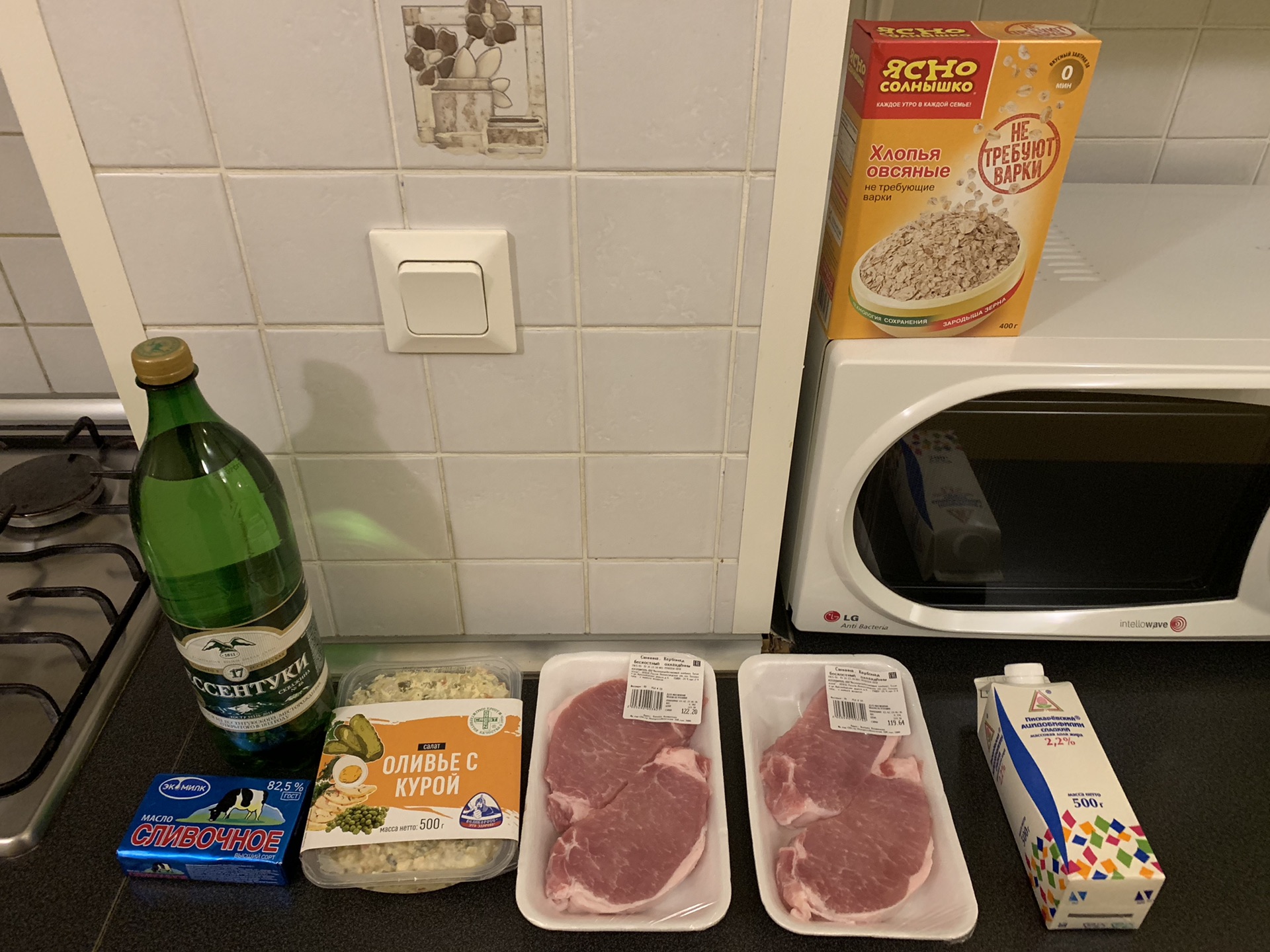 麦片作为主食;猪排+水果+气泡水,就这样开始了自己下厨之旅~