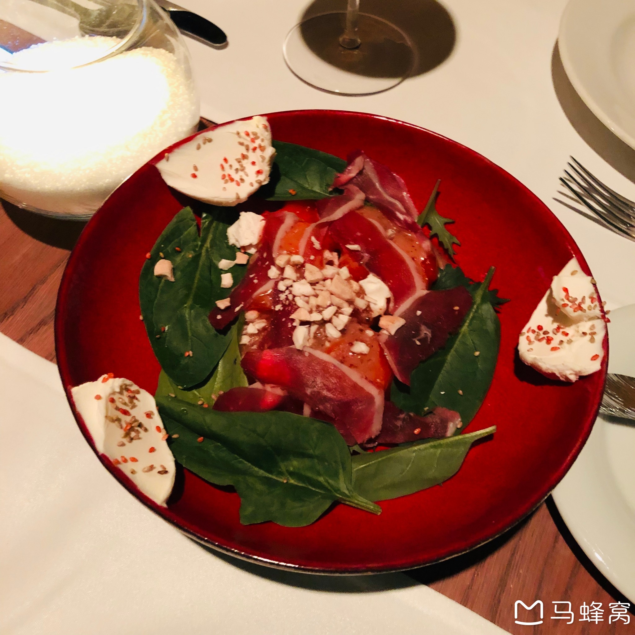 柿子,菠菜叶和生的熏鸭肉片的沙拉,周围三坨是干酪撒了些坚果碎末,790卢布