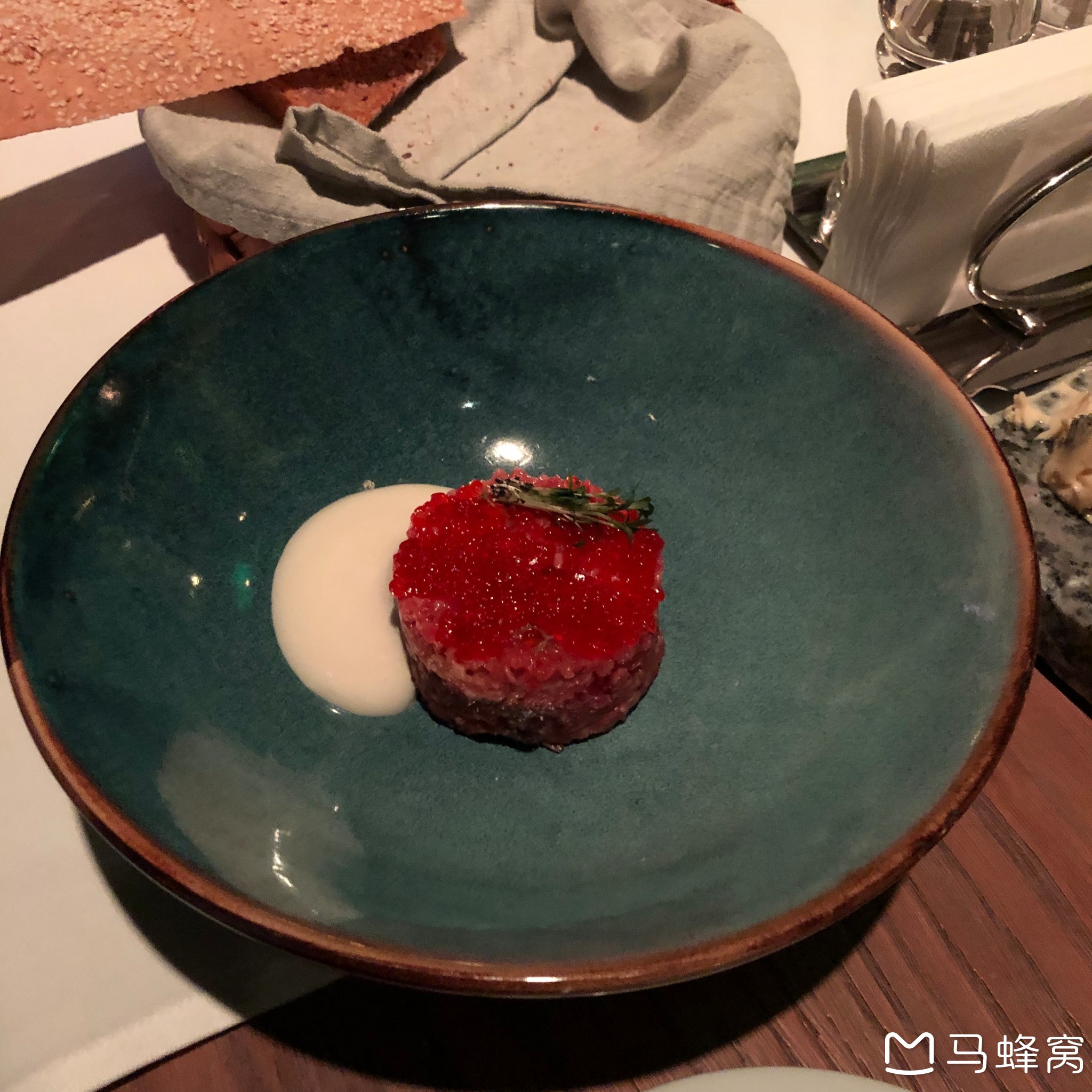 鞑靼牛肉就是生牛肉,不腥,搭配海水味道的鱼子酱,所以是咸咸的,也没什么牛肉为,吃起来也不像是吃肉,因为肉粒比较小比较软,更像是吃某种酱,不是那种惊艳的味道,普通吧。