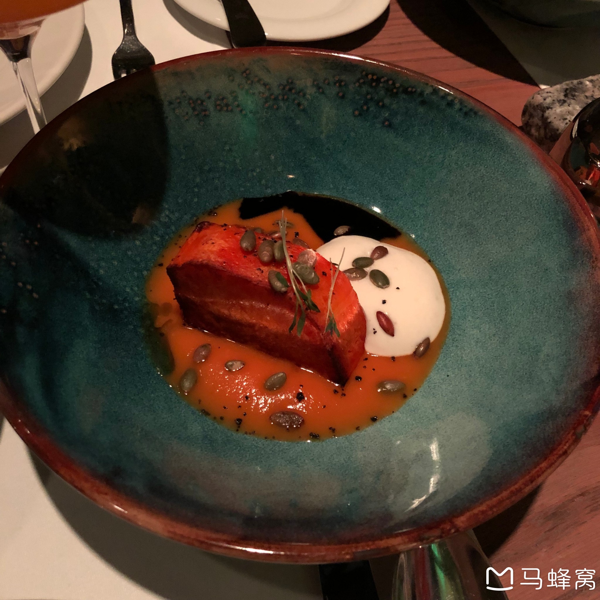 搭配parmesan 奶酪(白的那坨)和醋(黑的那堆),的确是醋,酸的,上面撒了瓜子,其他红色的酱就是南瓜酱了。非常非常特别,南瓜是炖得很软但不烂的口感,和在国内在南方吃到的南瓜非常不一样,筋很少,搭配奶酪和醋,简直惊为天人!!!从来没有试过这样这样的南瓜,强推!!当然,同行有一个小伙伴觉得蘸着醋比较怪,见仁见智。