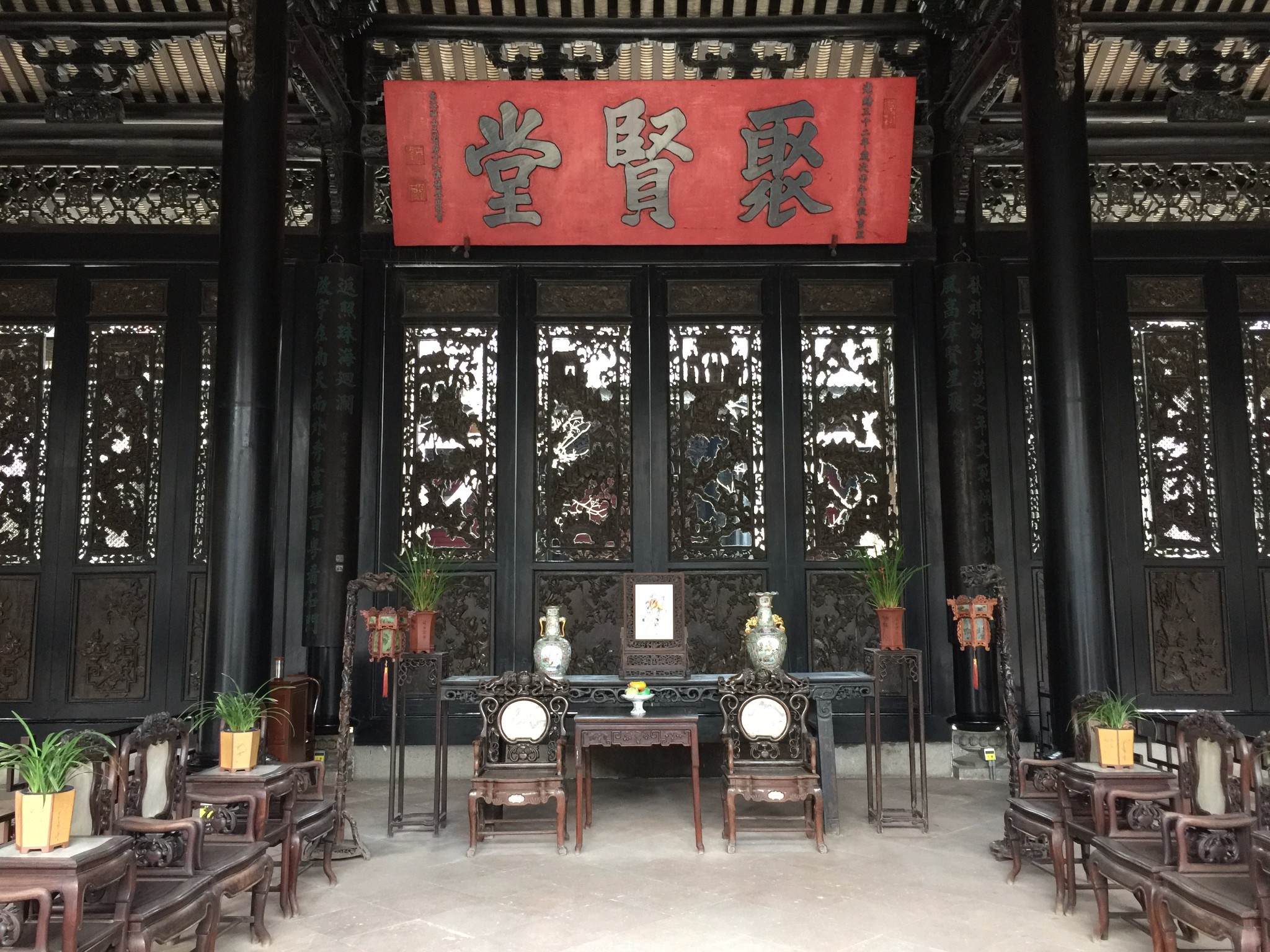 【百度百科】中进大厅聚贤堂为书院建筑的中心,是当年族人举行春秋祭祀或议事聚会的地方。堂宇轩昂,庭院宽敞。梁架雕镂精细,堂中横列的巨大屏风,玲珑剔透,为木刻精品。屋顶上的陶塑瓦脊长27米,全高4.2米,是清代广东石湾陶塑商号文如璧的作品。堂前有白石露台,石雕栏杆嵌以铁铸的花卉等图幅。堂宽五间,27米,进深五间,16.70米。用柁墩抬梁,设斗拱,21架6住出前后廊,属通堂木框架。后金柱正中三间装有12扇双面镂雕屏门挡中,两侧装设花罩。堂前有月台,石雕栏杆及望柱均以岭南佳果为装饰,镶嵌铁铸通花栏板,色调对比鲜明,装饰华美,突出了聚贤堂的中心地位。