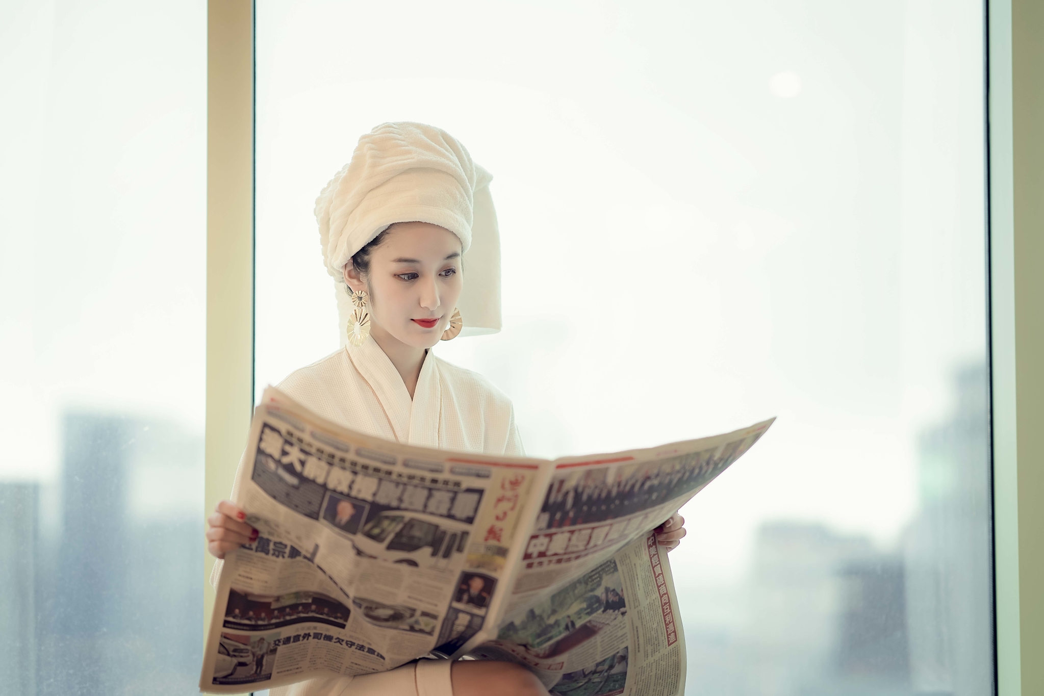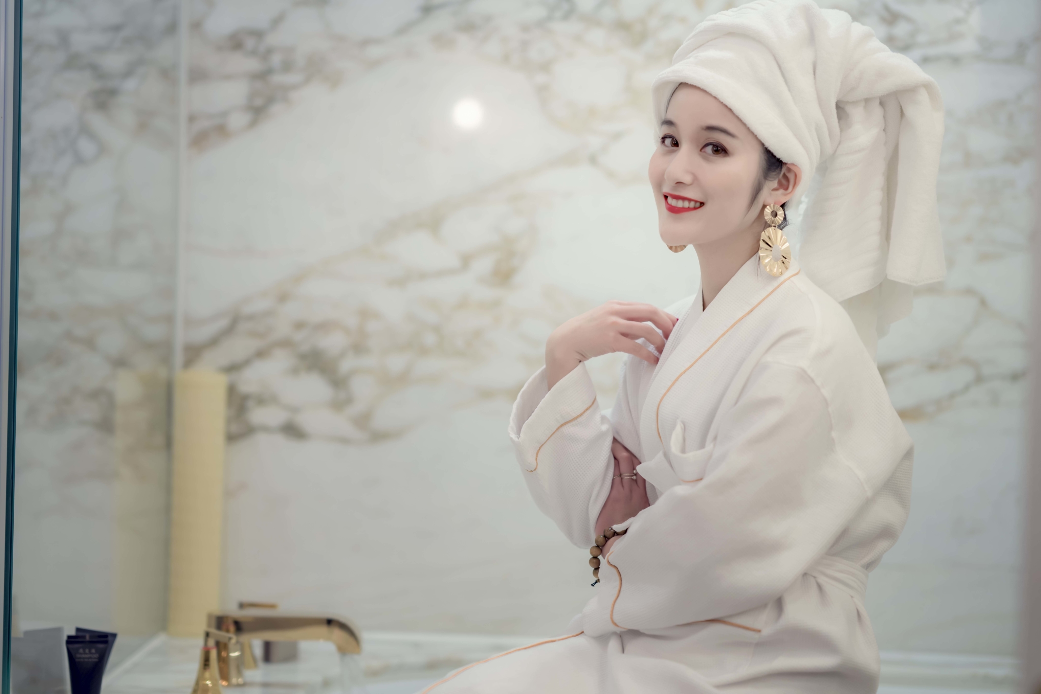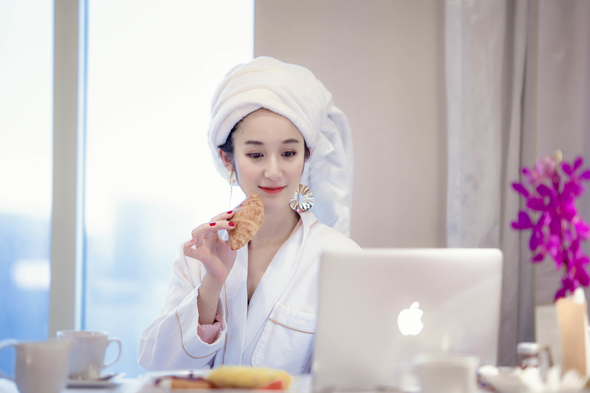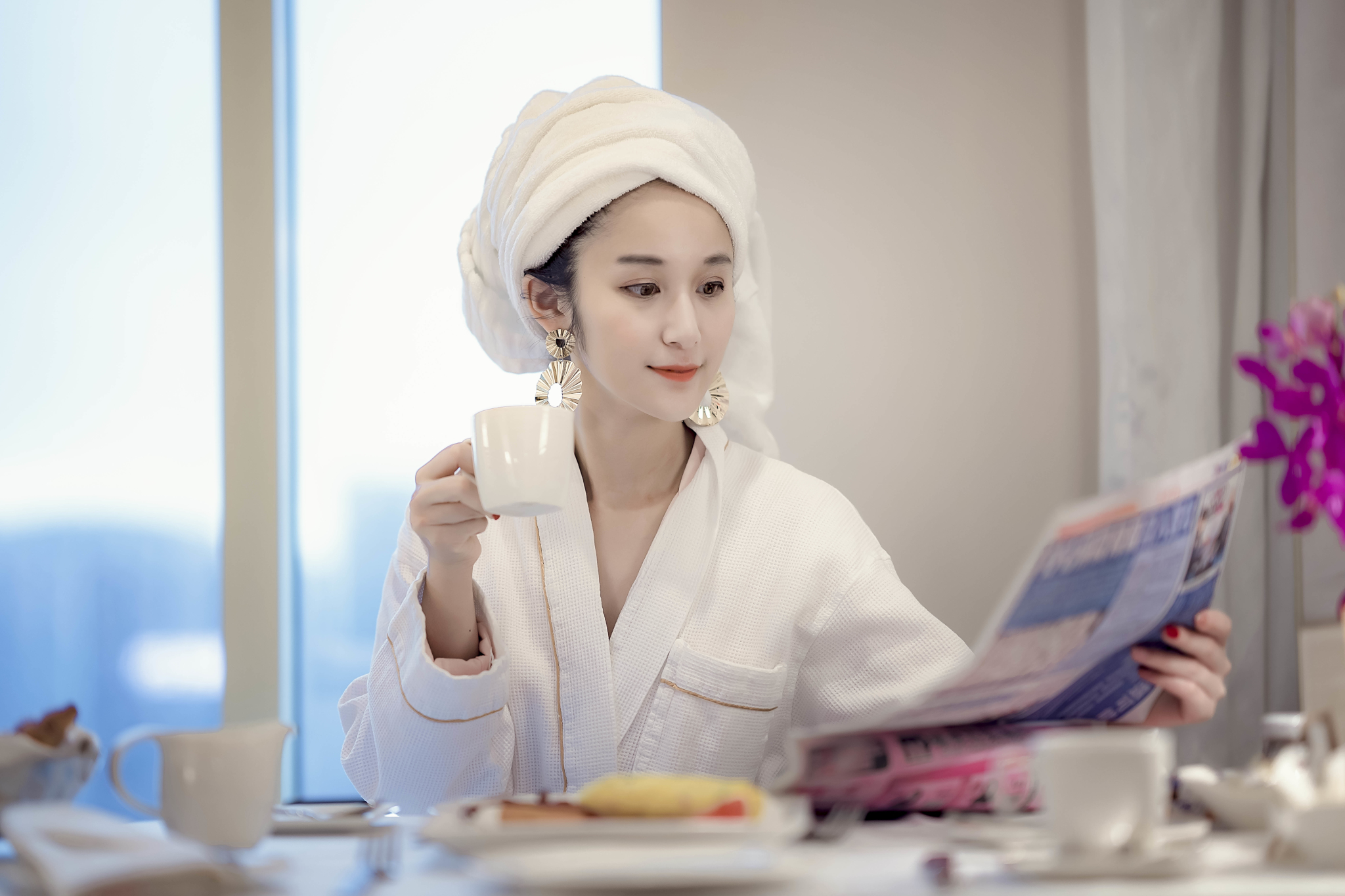 房间早餐,包头巾,大耳环,浴衣四件套是贵妇标配。不得不说,贵妇好难演,三斤重的浴巾压我头上简直路都走不稳了..
