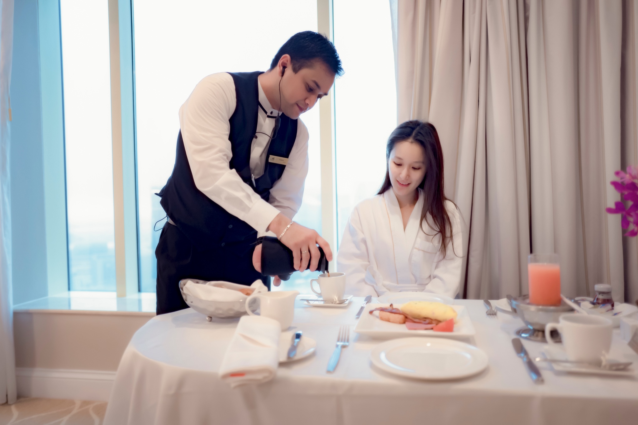 特别奢侈的叫了一个room service的早餐,整个欧式早餐228 港币,份量足够两个人吃。为啥这么奢侈呢,住如此豪华的酒店当然要不可免俗得扮一次贵妇(你们的阿果膨胀了,居然敢扮贵妇了)!!!