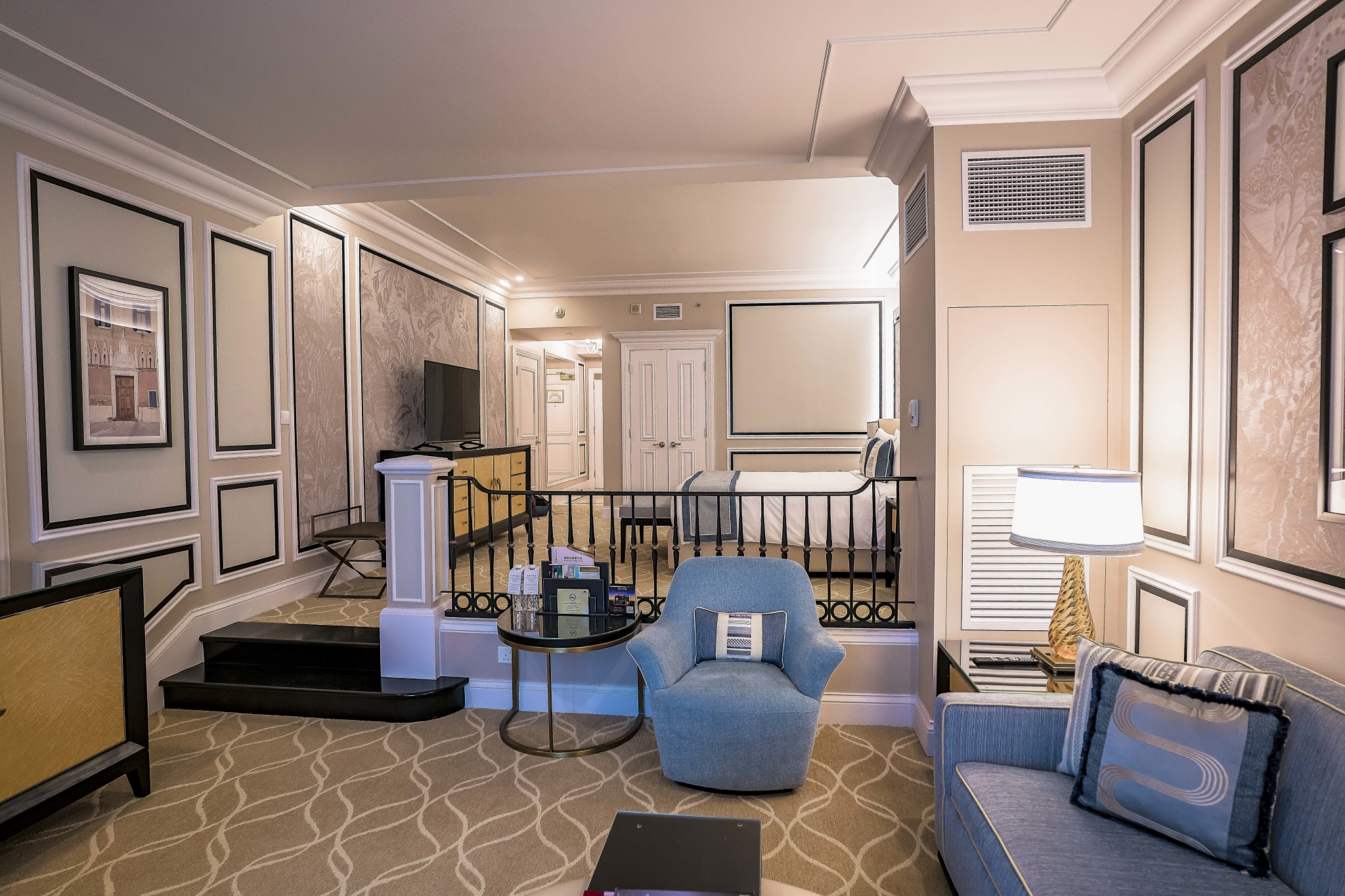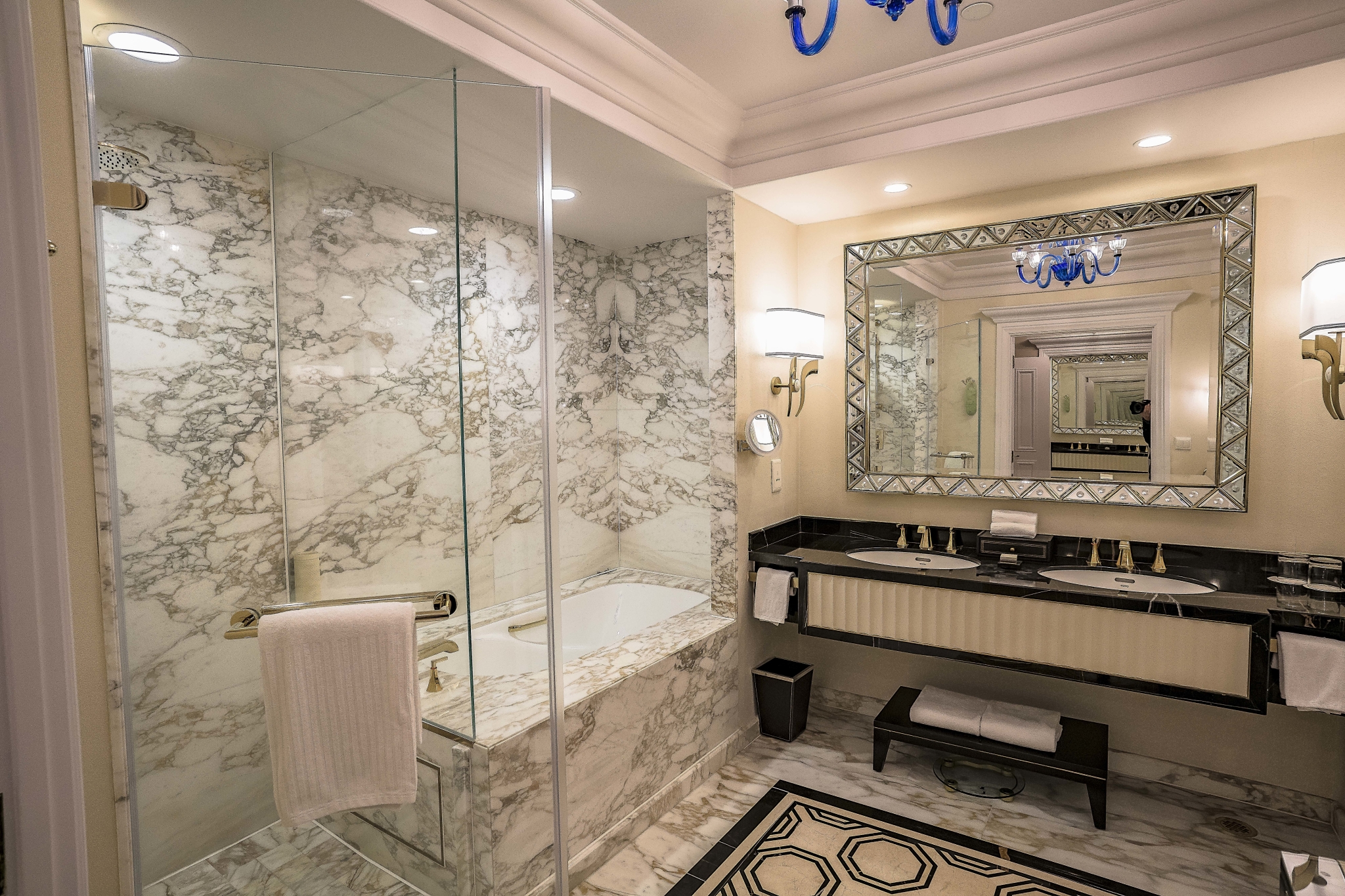 这次订的是威尼斯人的premio royales suite,据说是他们家的新套房,一进门熟悉的内饰,宽敞的洗手间,最喜欢威尼斯人宽大的洗手间,里面有专门的梳妆台,化妆洗漱完全不冲突,因为在34层,挑高很棒。
