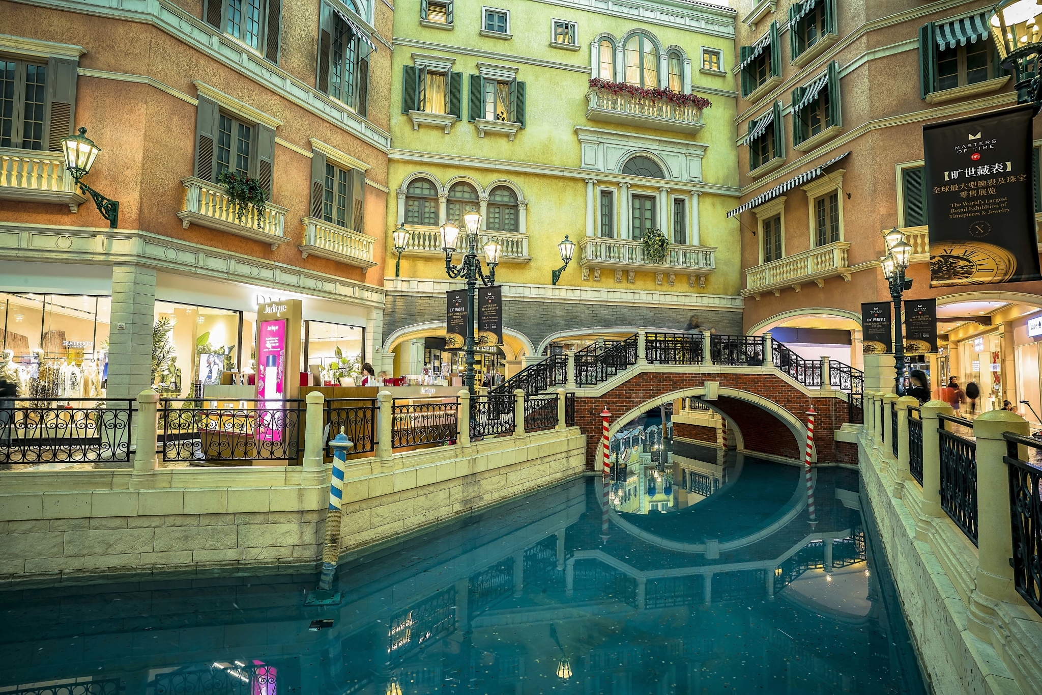 当然最具创意的就是酒店把整个威尼斯大运河搬进了酒店里,不管外面是晴是阴,在这里抬头永远都是白云蓝天。而这个天幕可以配合电脑控制的灯光效果,营造出日出日落的云彩和天空的亮度,当外面夜色渐晚,这儿则是越来越亮。