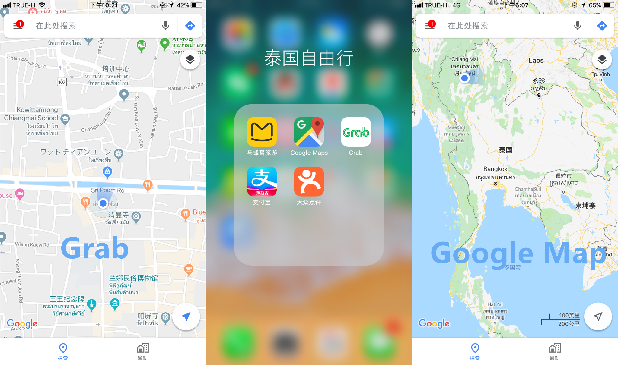 推荐几款在泰国出街旅行的必备软件。首先就是【Grab】,简单的说就是泰国版的滴滴,用法和滴滴基本是相同的,可以直接绑定支付宝进行支付十分方便。在泰国叫车突突会要高价而坐出租又怕绕路,该怎么办呢,Grab完美解决了这些问题,和滴滴不同,在软件里输入目的地Grab会直接给出一个价格,不管司机走哪条路最后都是一口价,清晰透明不怕被宰,即使要打车也可以先上Grab看一下价格这样打车和司机讨价还价时也可以做到心中有数。其次就是【Google Map】,到泰国后百度地图基本上已经半瘫痪了,想要准确的找到地图和路线当然少不了谷歌地图啦。