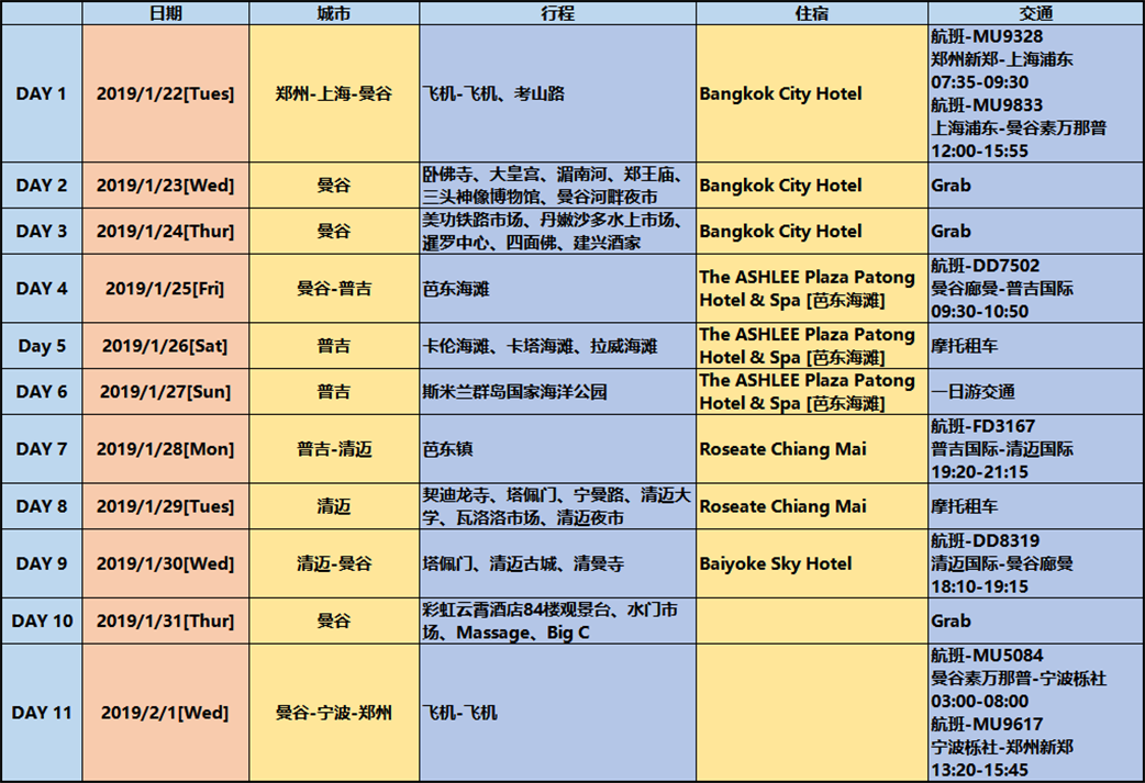 定晚了价格大涨,最后只好定了曼谷的往返。泰国境内采取曼谷飞普吉,再飞清迈,最后回曼谷,分别定的泰国皇雀航空和亚洲航空。整个行程中的酒店都是在马蜂窝上预定的,附上整个旅行的行程表。