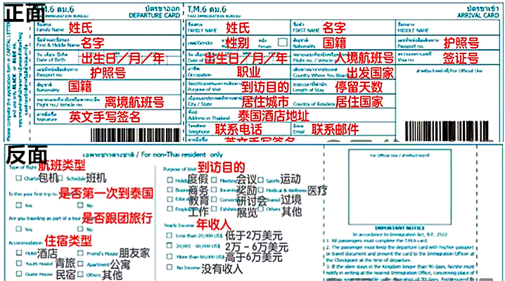 入境表格航班上空姐会发,主要内容是姓名,护照号,籍贯和在泰国的住址之类的信息,可以参考下面的模板。