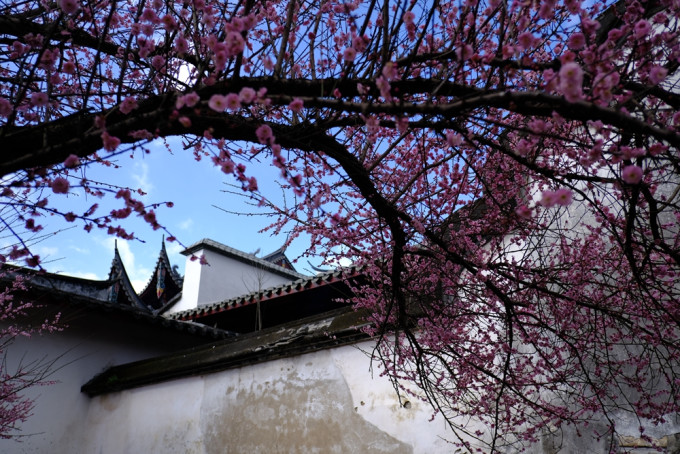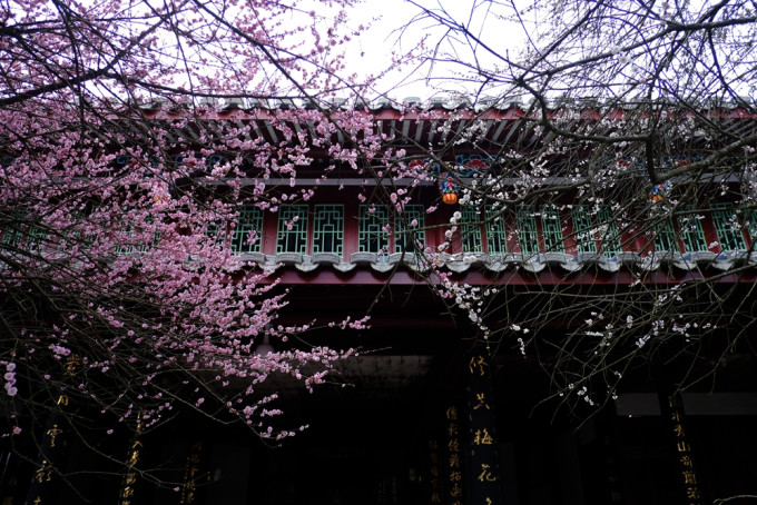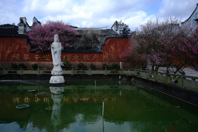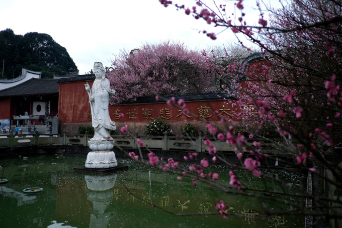 来林阳寺赏梅可千万不要走漏了梅园这一去处,寺里有两棵树龄超过300年的梅花便栽种于此。它们一棵为红梅,一棵为白梅,红白相互衬托,更显风姿。“零落成泥碾作尘,只有香如故”。看着地面上、水塘中的梅花花瓣,我由情不自禁想到陆游的这句诗了。花开不同赏,花落不同悲。欲问相思处,花开花落时。林阳寺的梅花,我想和你再一次约会。
