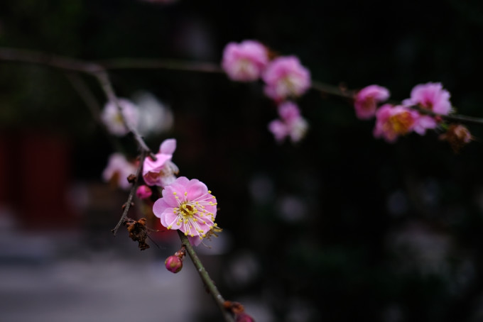 林阳寺的梅花以红梅居多,也有少数的白梅。无论是红梅还是白梅,它们都给古寺增色不少。这让我想起许多咏梅诗句,有王安石的“墙角数枝梅,凌寒独自开”、陆游的“何方可化身千亿,一树梅花一放翁”、也有崔道融的“朔风如解意,容易莫摧残”。古人爱梅,也借梅花抒发心境,而我比较俗,除了赞叹林阳寺梅花之美外,还是它的美。