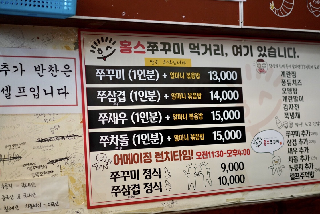 1人份小鱿鱼13000韩元,二三四排依次是加五花肉、虾、牛肉的价格。