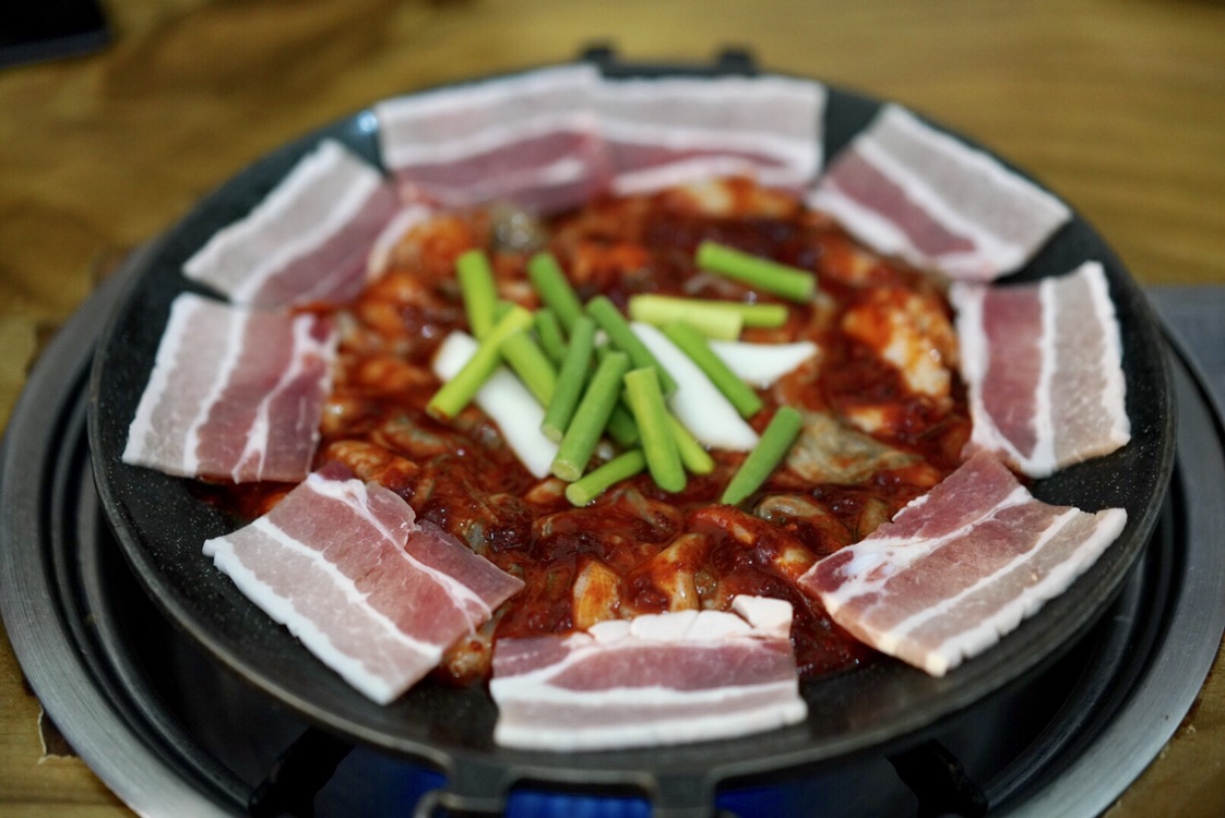 点了2人份鱿鱼+五花肉锅(包含鱼子炒饭),开火等着它煮沸变熟,然后就可以开吃了,个人因为很喜欢韩料的甜辣味,所以很爱这个味道,就是有点辣喝了好多冰水。