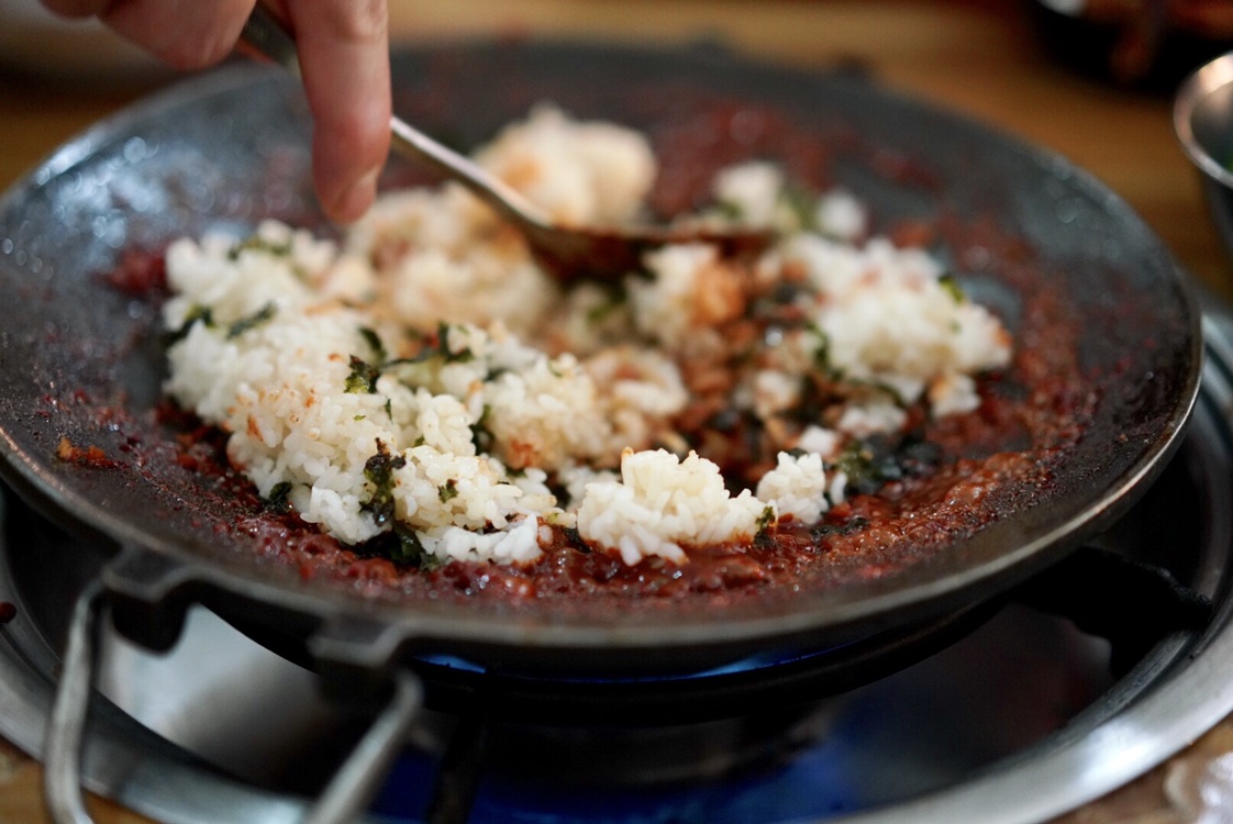 稍微吃一会儿就可以让服务员把小鱿鱼和五花肉盛出来,剩一点汤汁加上米饭和紫菜做鱼籽炒饭,炒均匀之后用勺子压平再铺上满满一层鱼籽,鱼子炒饭的口感入口咬下就像烟花爆开的感觉,喜欢!!!