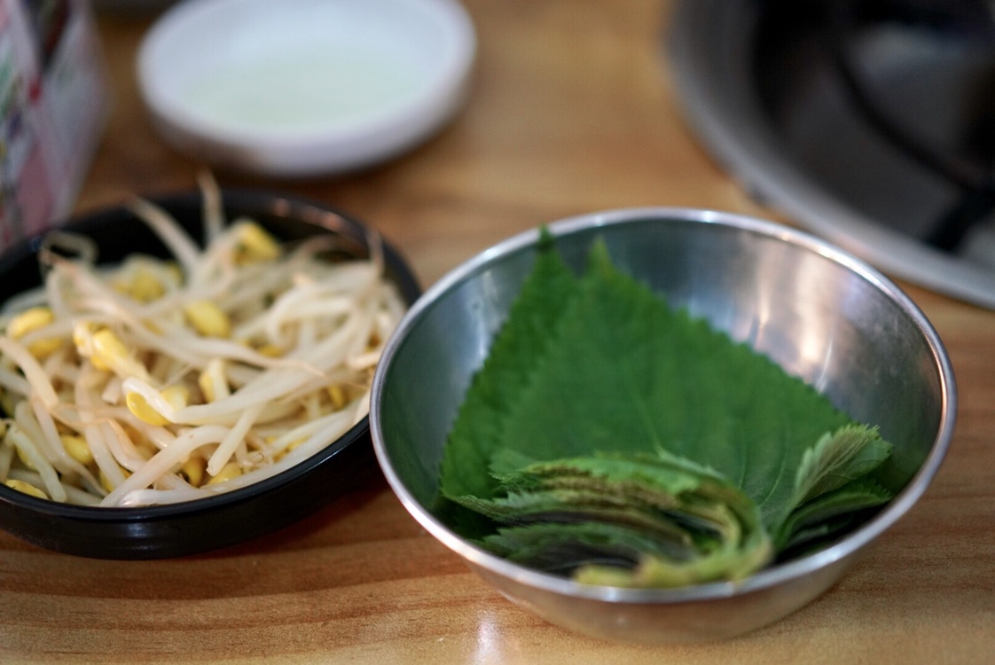 韩国人真的很爱豆芽和紫苏叶,喜欢用紫苏叶包各种荤菜吃。