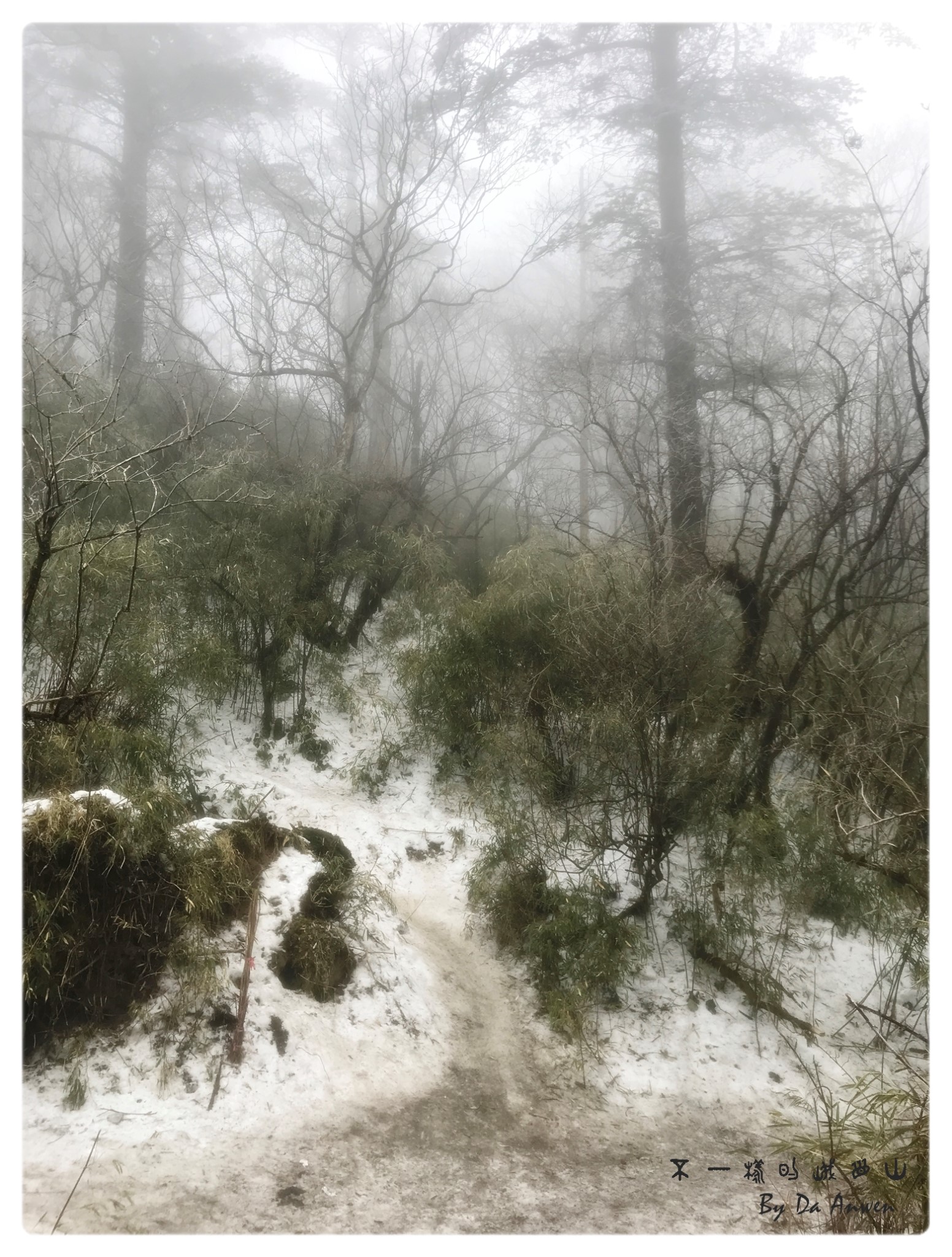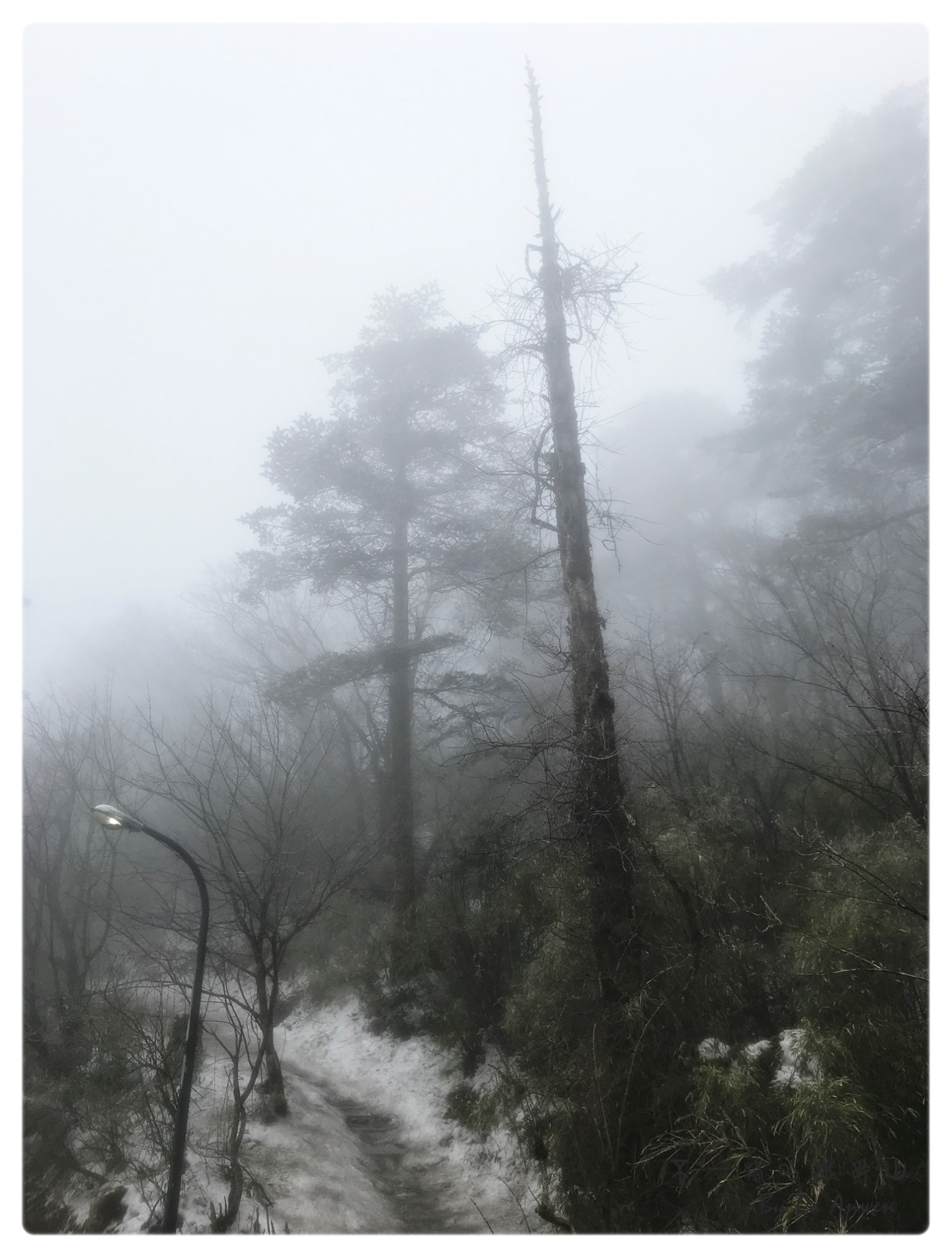 一路石阶而上,登山的步道上还是存留着一些冰层,需要小心翼翼的行走。两边的山体里则覆盖着厚厚的雪,但是雪并不白了。