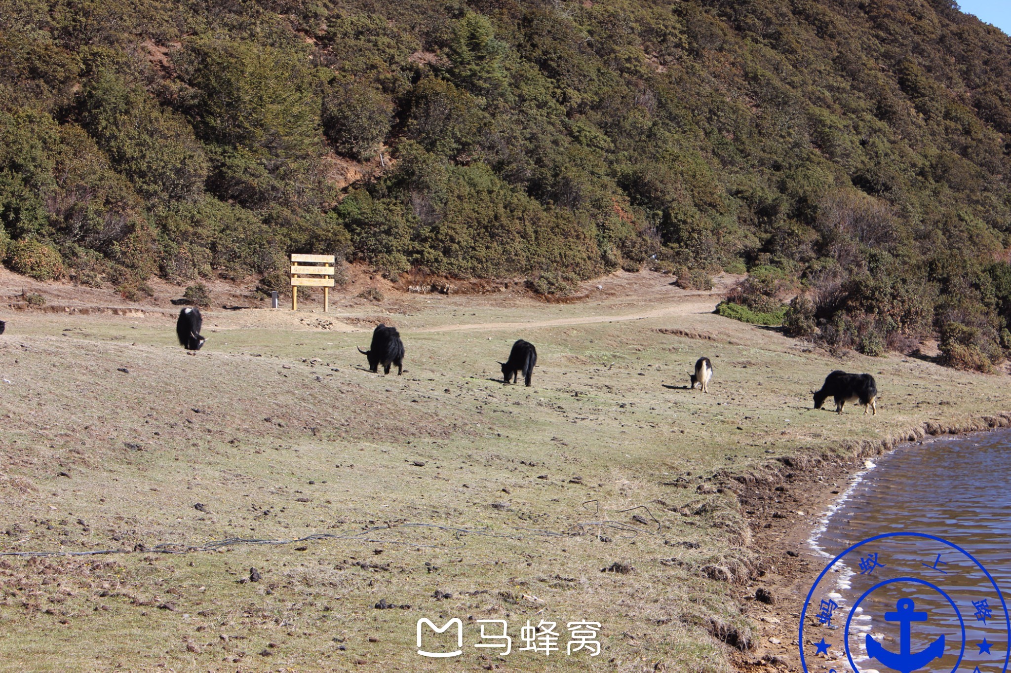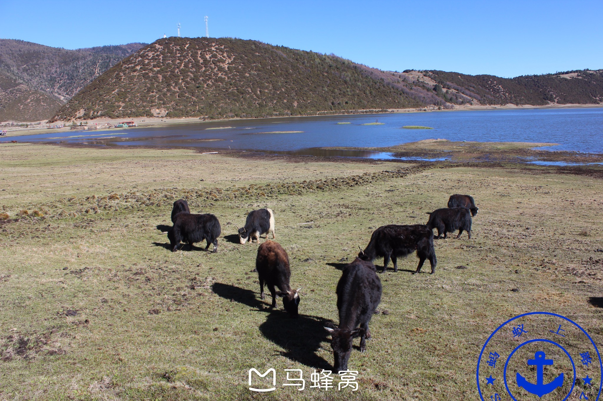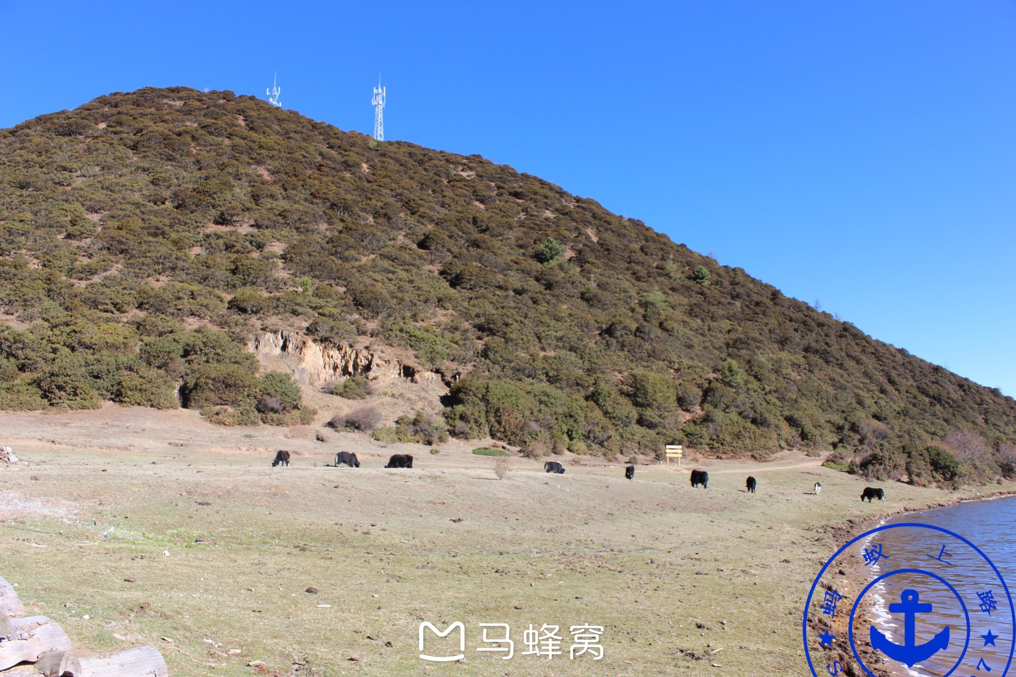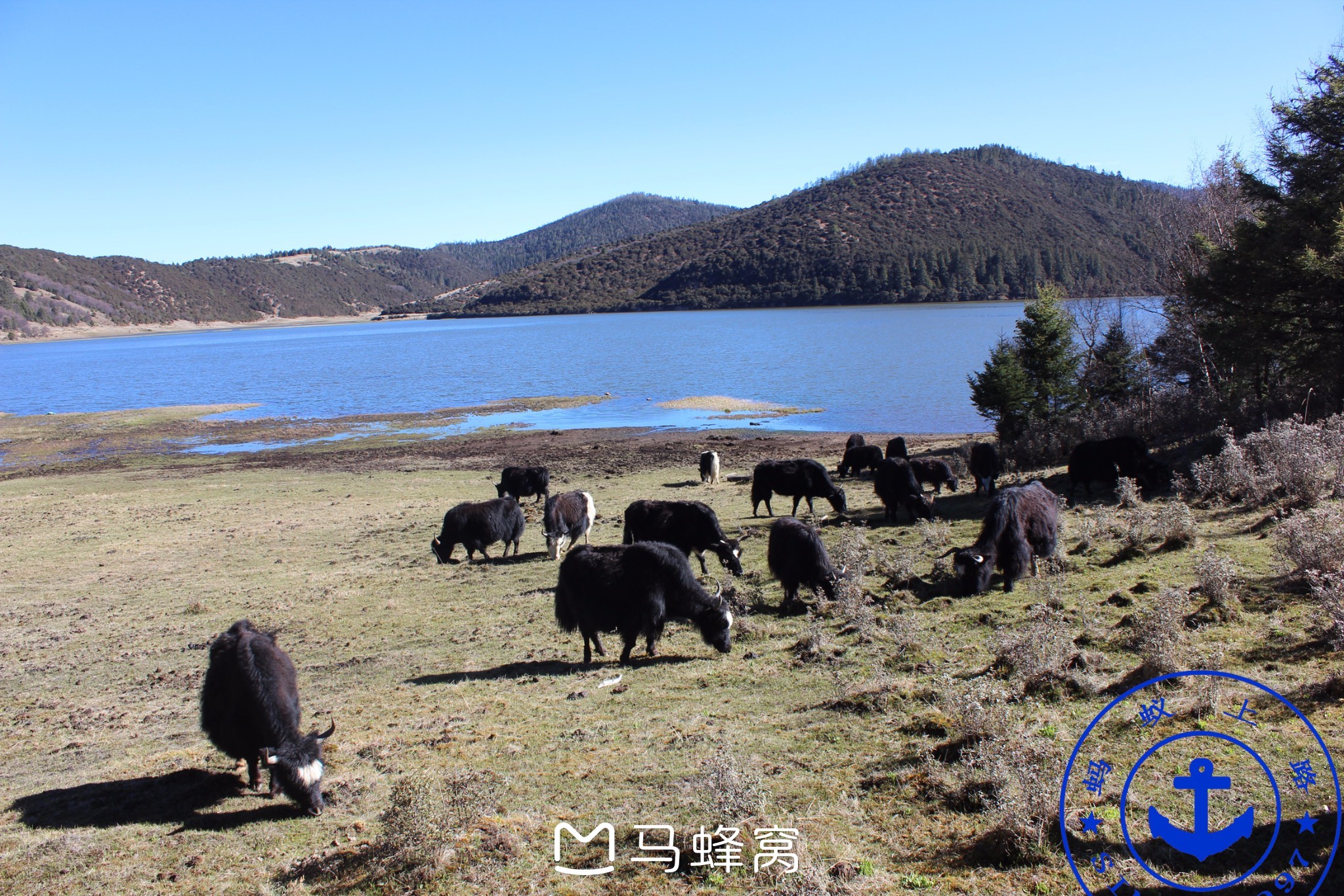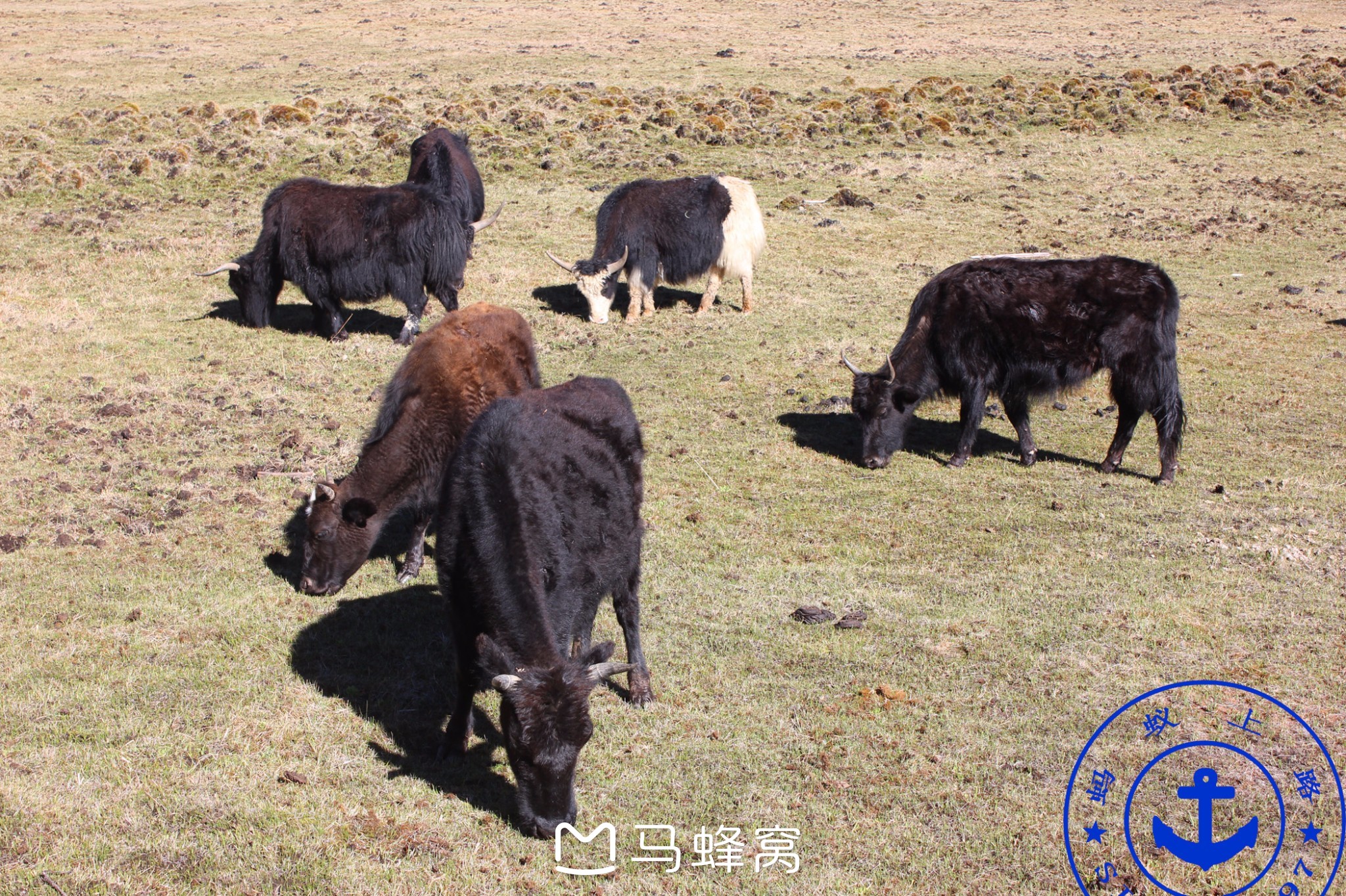 今天是五一,又是早晨,所以大家的兴致都很高,有说有笑的。天空瓦蓝瓦蓝,感觉很低,好像触手可及。空气真的像过滤过似的,非常干净,清新,在雾霾肆虐的沿海,想吸一口这样的空气都是奢望。湖边,一只只牦牛低着头,悠闲地啃着草,根本没感觉到我们的存在。
