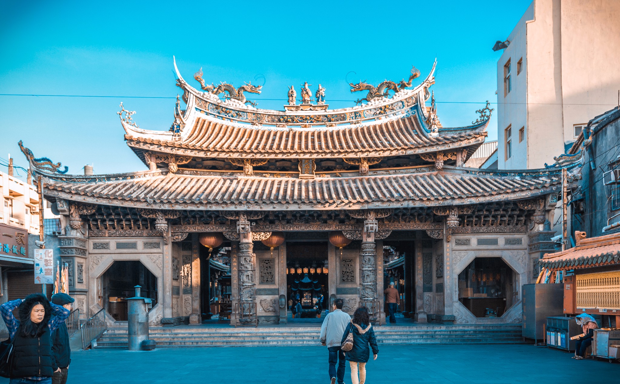 鹿港的街道,鹿港的渔村妈祖庙里烧香的人