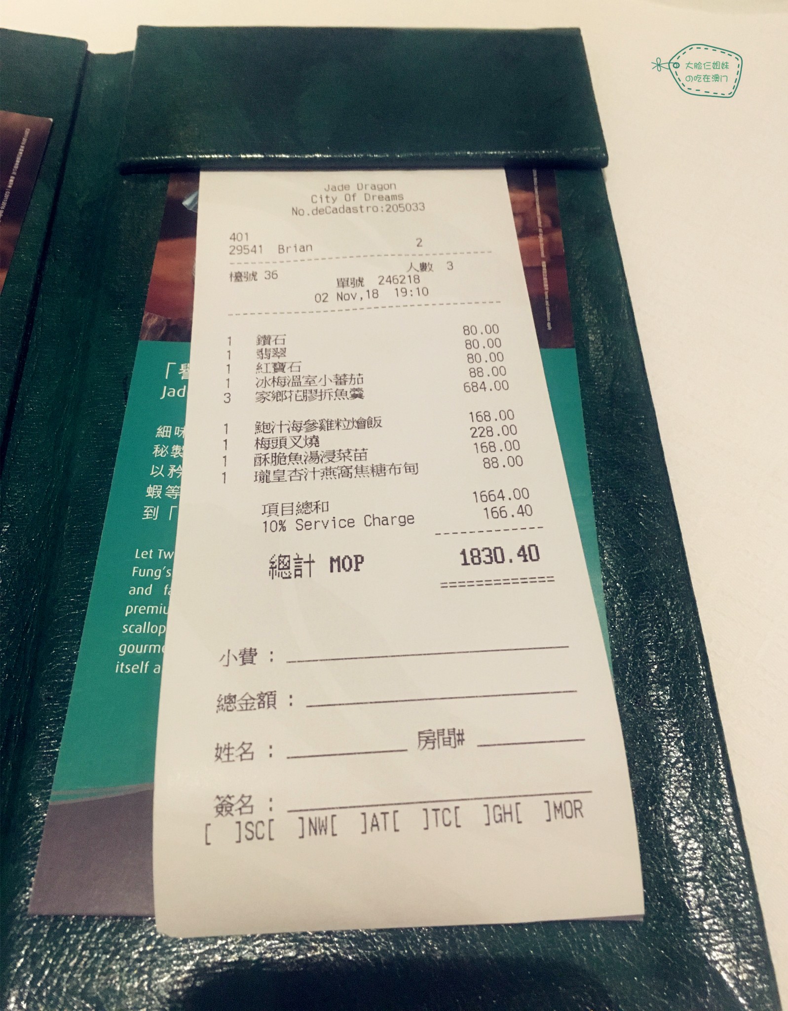 餐厅如果有新濠天地的会员卡可以打折,我们当时不知道没有先去办理,所以没有打折。此餐折合人民币为1581.1元,人均527.03元。人均500的米3很划算了,有兴趣和预算的朋友真的可以来试试!