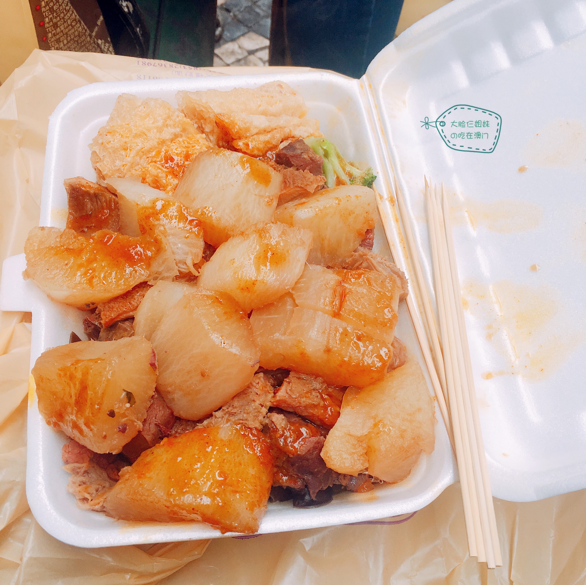 只拍了这一张图。店不大,而且没有位置可以坐,只能坐在对面的长椅上捧着吃。我们点了一个大份的牛杂,加了挺多别的菜,一共210澳门元,人均70澳门元。其实,这家本来是当小吃来尝尝的,我们是因为早餐吃的太晚太多,还很饱,所以吃份牛杂当做午餐。性价比着实不高,味道也不如从前,后面我们每个人都吃到快要吐了,说再也不要吃牛杂了