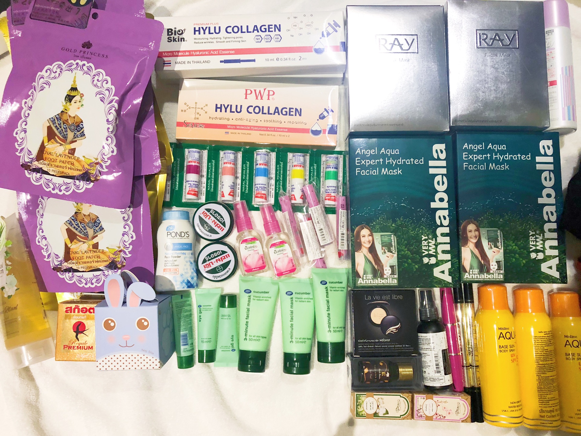 除了每次出去玩必买的护肤和彩妆产品,我还买了泰国特产——足贴、驱蚊液、鼻通、精油等日用品。