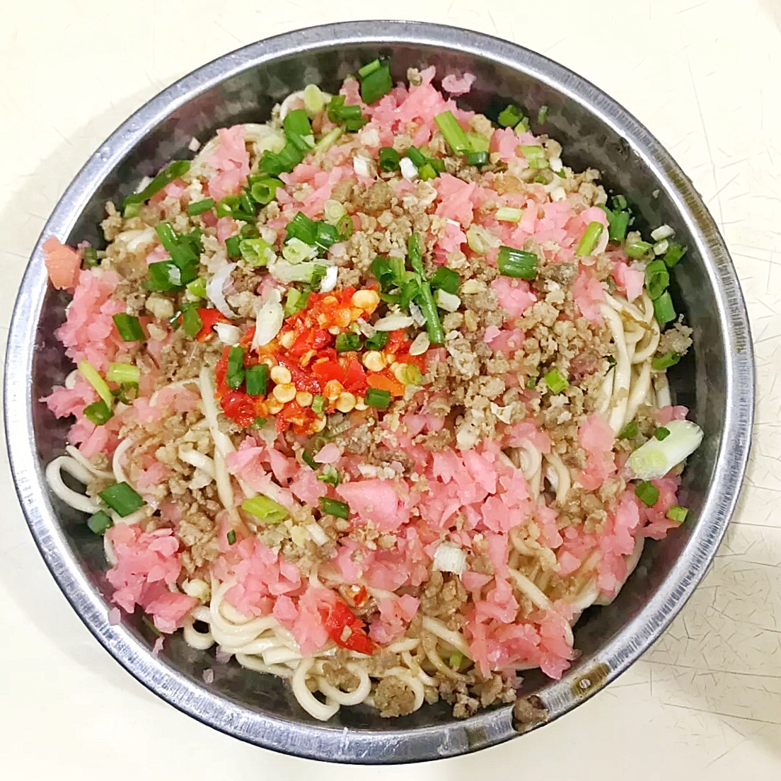 他们家的酸萝卜面味道那么多年都是依旧美味 酸萝卜脆爽清香 碎肉也丰富 搅拌后简直优秀!