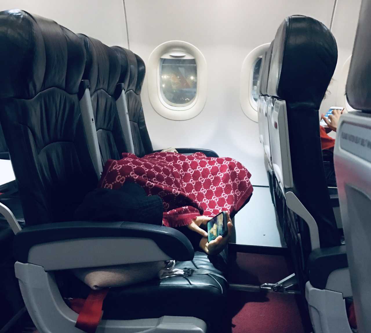 新航线没什么人,我在飞机上到处乱窜,跑到安全通道座位伸个腿,又跑到空排位子上横躺着,带个厚披肩太有必要了。