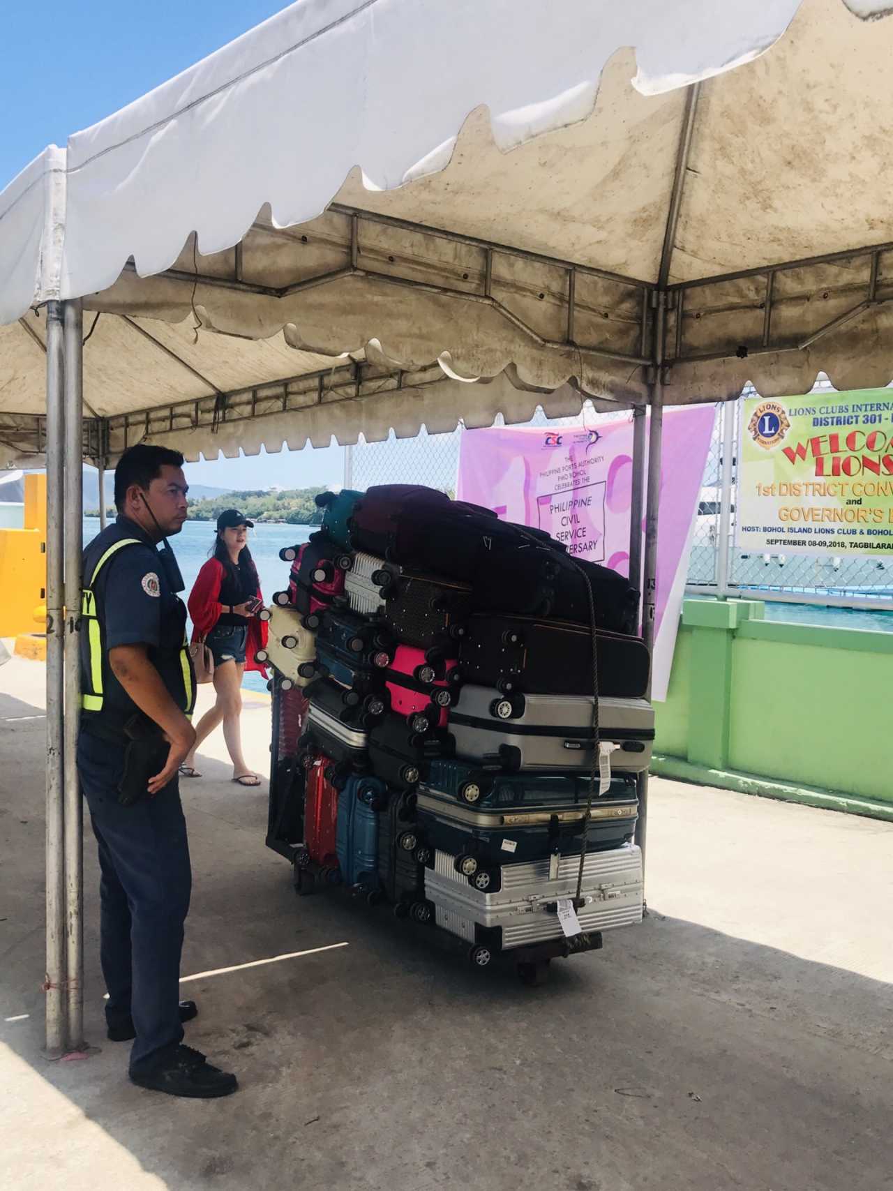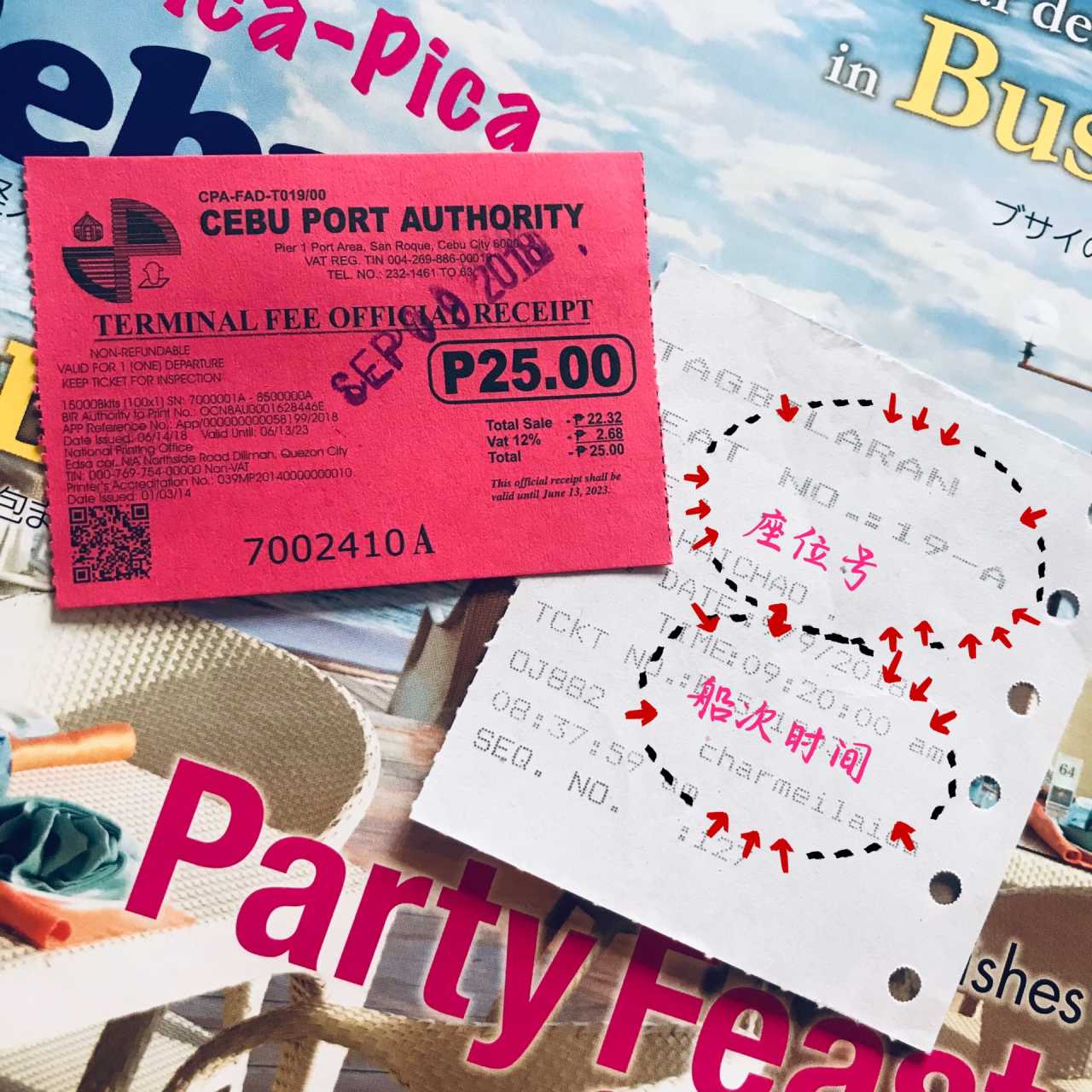 交了税会给你一个小票,下图红色票,然后拿着小票过安检,进去以后左手边是Ocean Jet家,把电子船票出示给工作人员换纸质票就好,然后会有人找你拿行李费并拿走你的箱子,不同大小价格不一,我的18寸登机箱收了50比索。