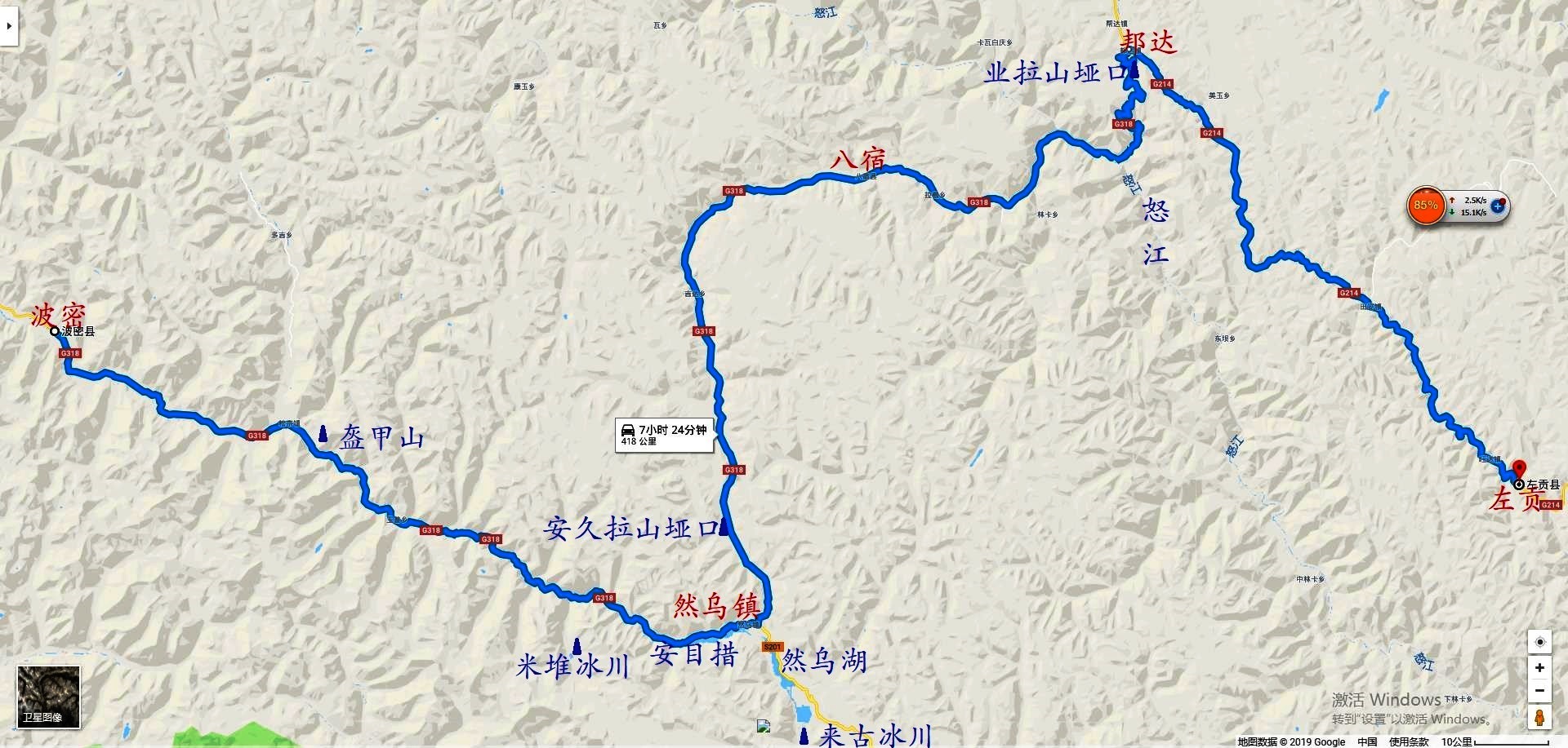 6月27日,沿318国道从波密出发途径然乌镇、八宿、邦达经过大约420公里的路程到达左贡。此路段的主要风景包括帕隆藏布江、盔甲山、米堆冰川、安目措、然乌湖、来古冰川、怒江。途中还要