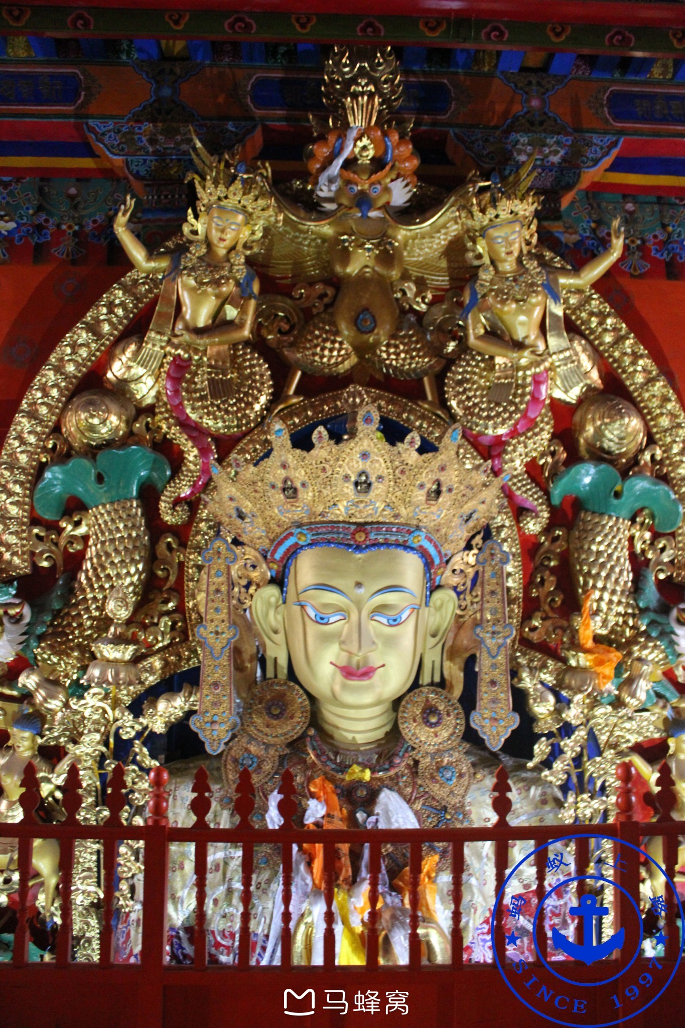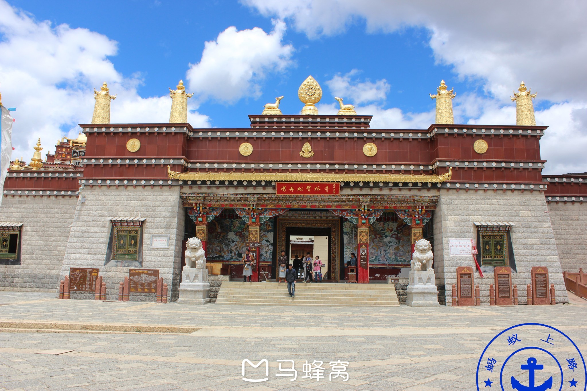 释迦摩尼大殿,建于1679年(清康熙18年),总占地556平方米,内有四根通天柱,主供文殊菩萨坐像,高13.58米,坐像周围壁画为释迦摩尼一生图,当年红军长征过香格里拉时,贺龙元帅曾亲临此殿。