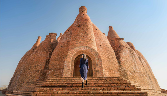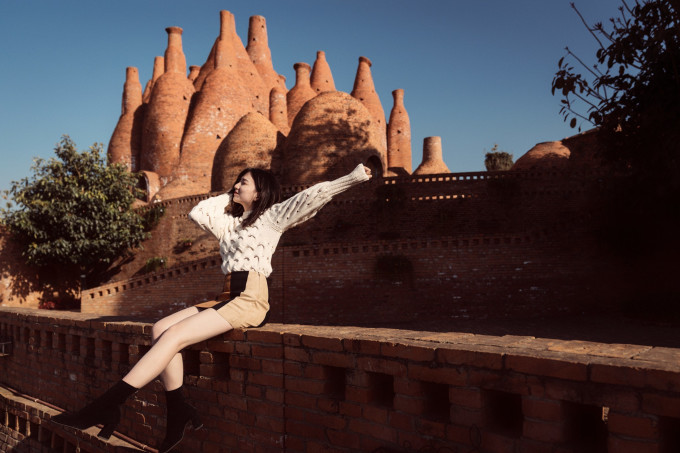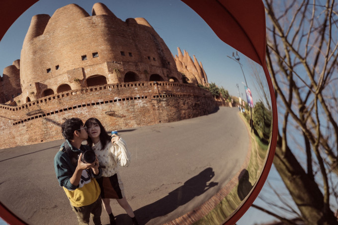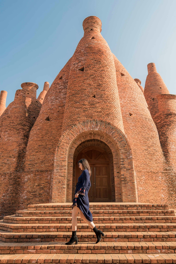 “万花筒艺术庄园”运用了超现实和后现代的建筑风格,未用一根钢筋,一颗钉子,仅弥勒本地生产的红砖就搭建而成。这样一个看似毫无章法的建筑,出自一位出生于弥勒的“奇人”之手,他名叫罗旭。他从未受过系统的艺术院校教育,也就是常说的野路子,据说这个建筑连设计图都没有,如蚂蚁筑巢一般,随心而动。这样粗糙的方式搭建,却将三种当地文化混合其中,酒瓶状代表的是弥勒的红酒文化,还有彝族的火文化和共生向上的文化。在现代设计如此完整的今天,你依旧不得不佩服这种第六感般的天生创造力。而我也愿意用12个小时的时间,去感受这里的光影变化。