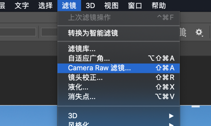 ▼在PS的顶部菜单中——选择滤镜——Carmera Raw滤镜(如果你拍摄的是raw格式的照片,在点开的时候,就会自动优先进入这个滤镜)。