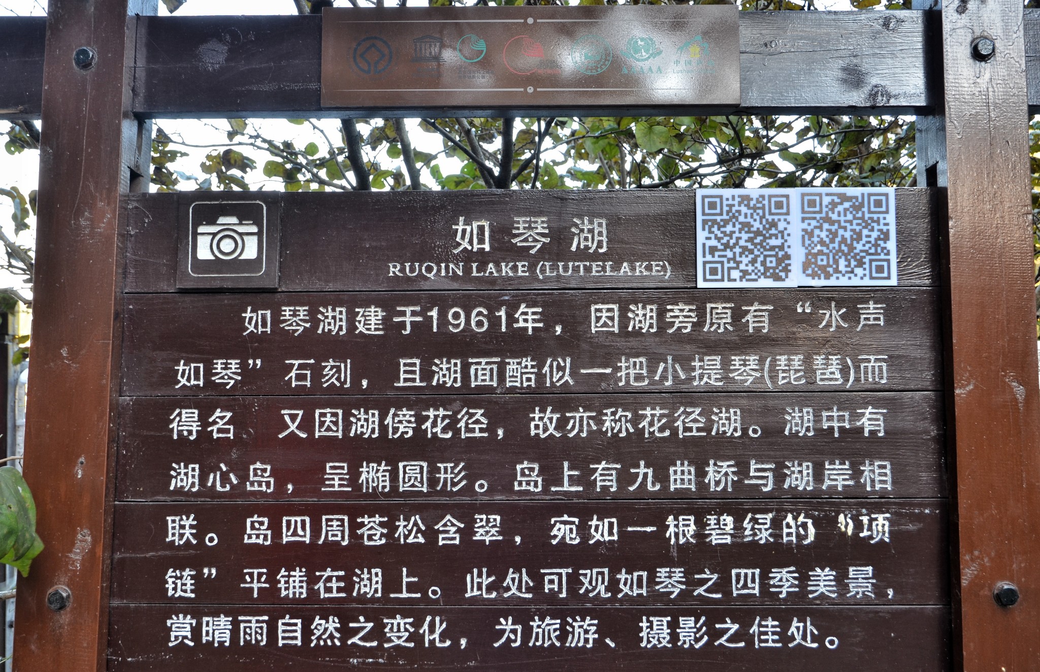 如琴湖,因湖岸曲线玲珑,湖面酷似一把小提琴,加之湖边的石上有古人刻的“如琴”二字,故得名。湖半边近靠花径园内,又叫花径湖。有曲桥通往湖心岛,园中繁花似锦,曲径通幽,湖光山色,风景如画。