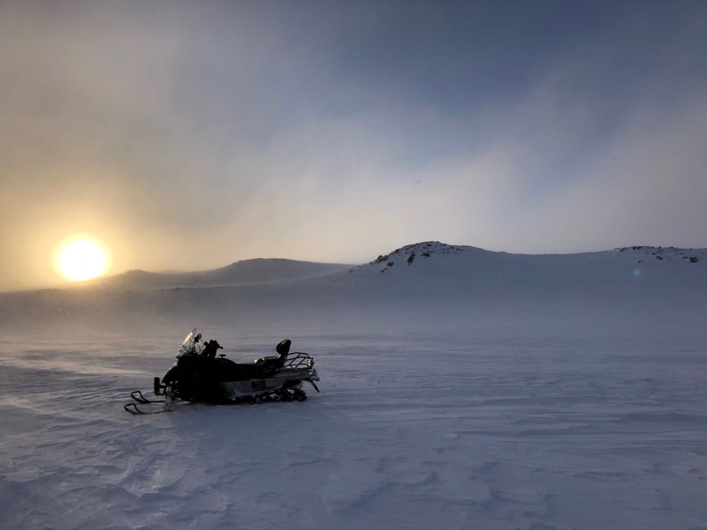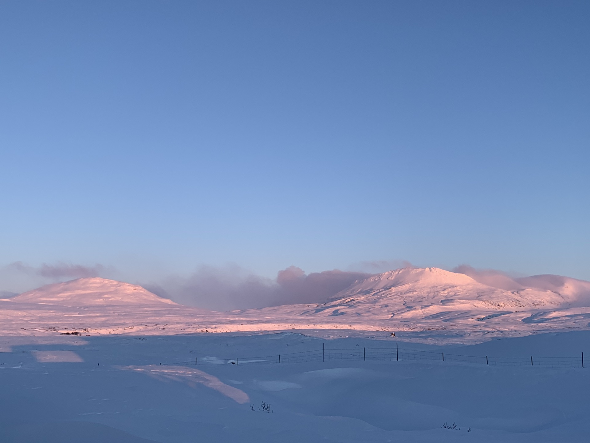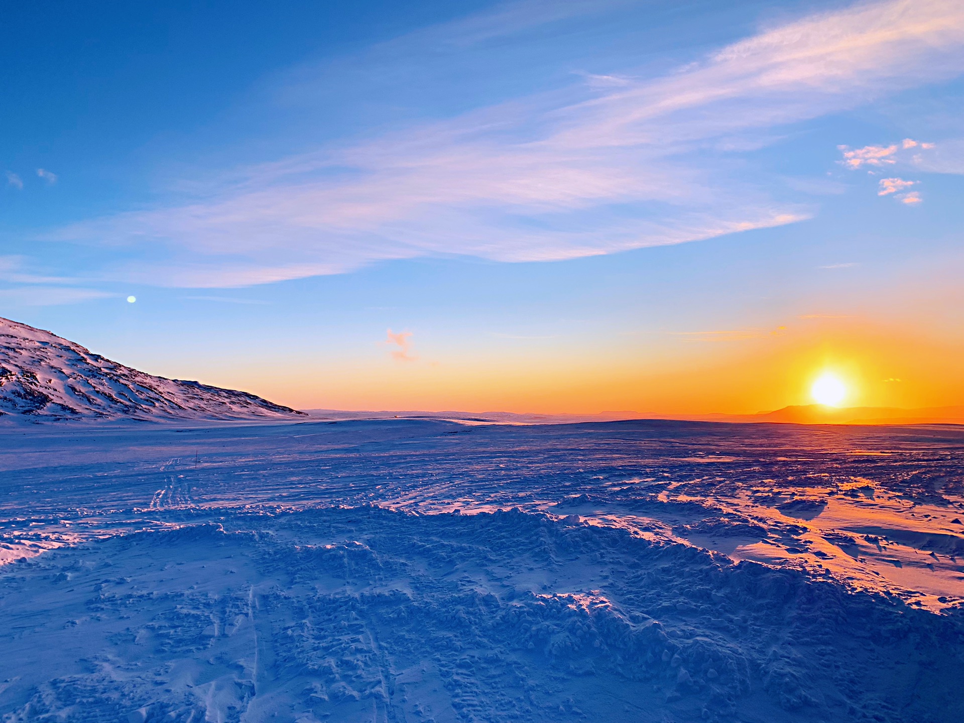 这天的最后我们去尝试了雪地摩托。那天我状态很不好,可能有点冻傻了。平时开车如此骚包的我,那天看见雪地摩托,就不想开。老闺蜜劝了我好久我就是坚持没开,让老闺蜜载着我兜了半个小时的风(真的是兜风,风大到凌乱的那种)。开完正好遇上日落,天空和雪的颜色都很美。不禁感慨大自然真是魅力无限。和老闺蜜又说起了我们俩常说的一句话:“人眼才是最好的相机啊。”怎么样都是觉得看到的景色要比拍出来的美很多(当然,我拍照技术不咋地也是重要原因之一)。不过晕车的小伙伴一定要慎重啊,去开雪地摩托前要先坐一路颠颠簸簸爬到朗格冰川深处,路况确实很不好。老闺蜜自从坐了那一趟,晕车好几天都没缓过来。