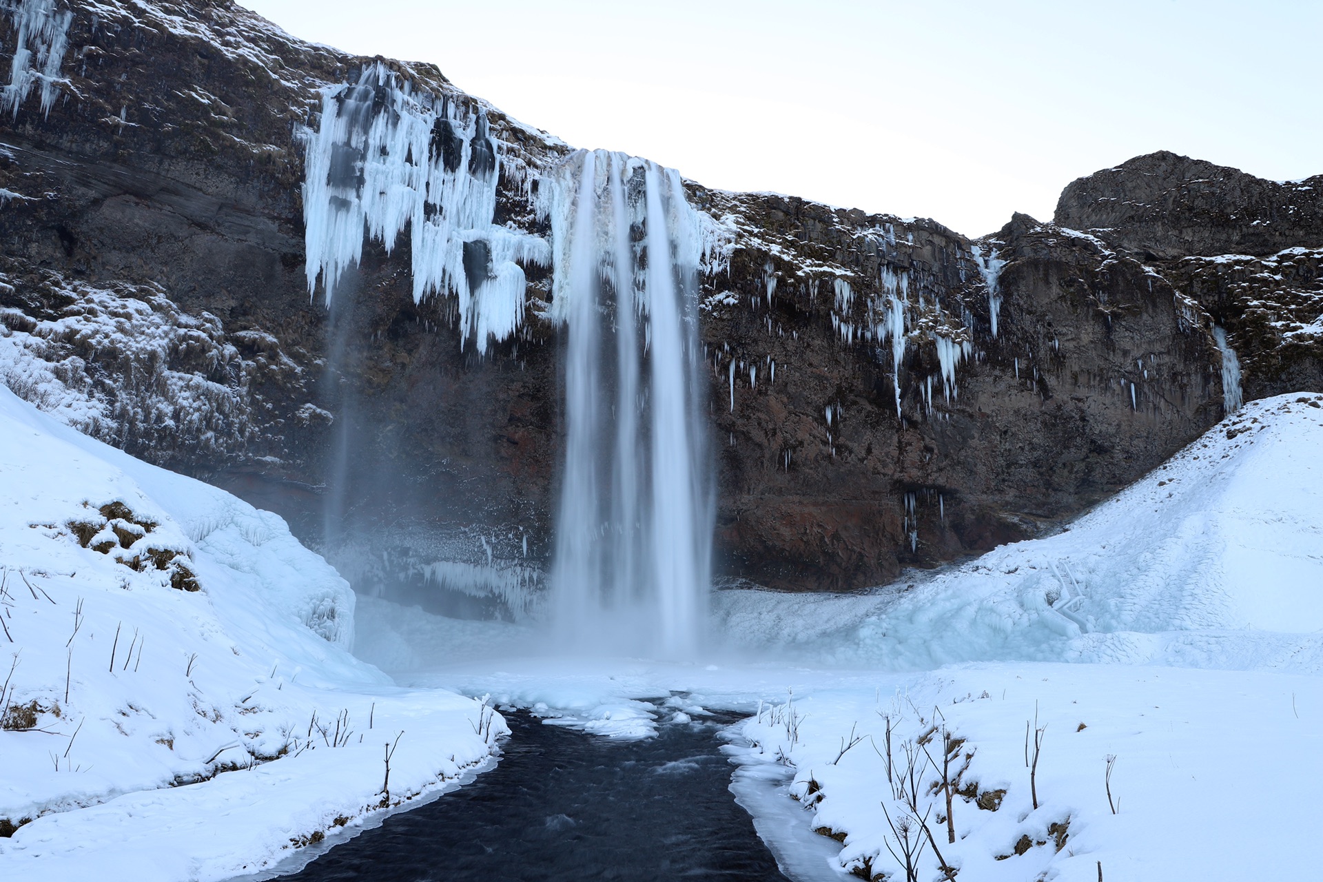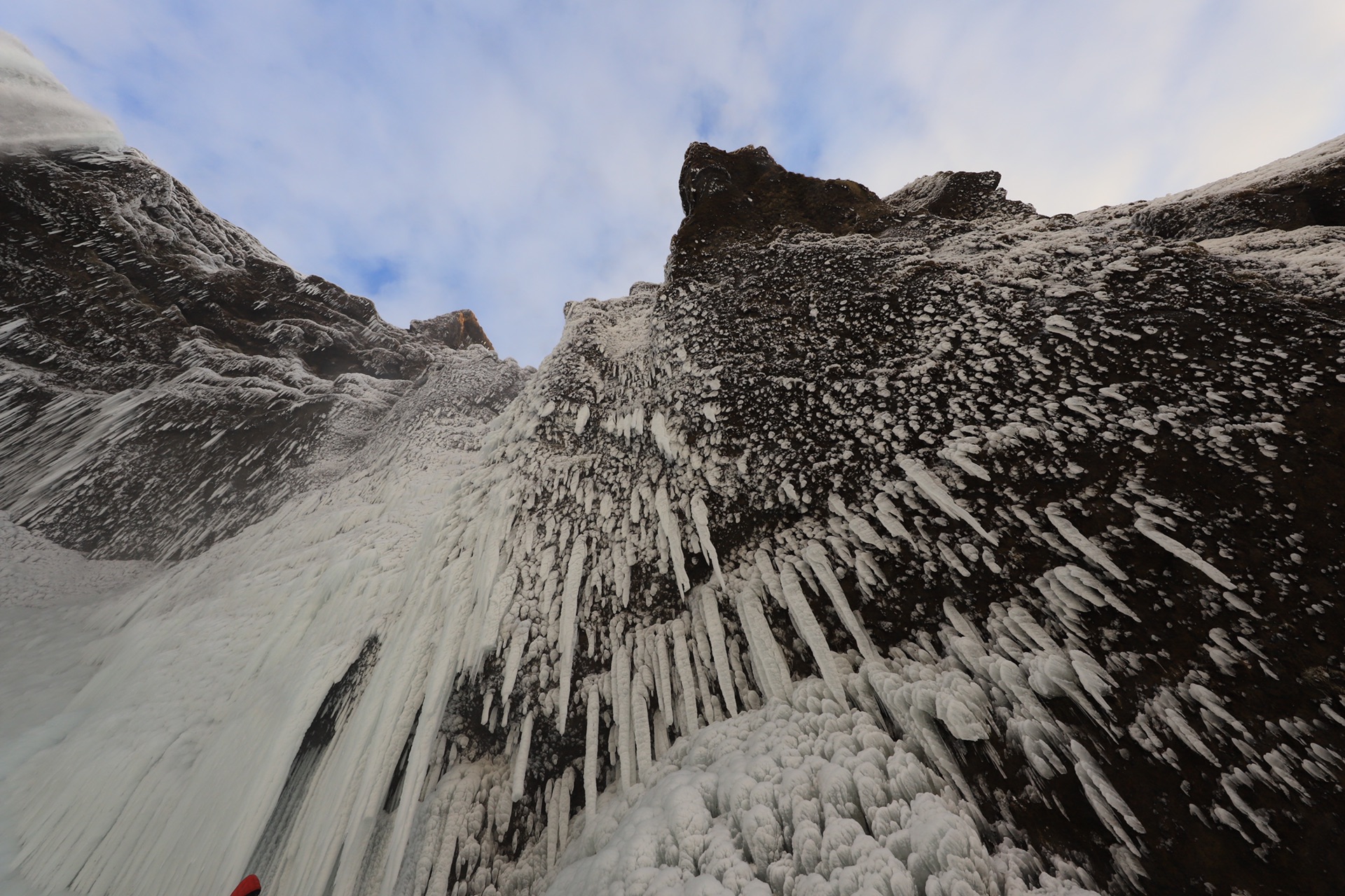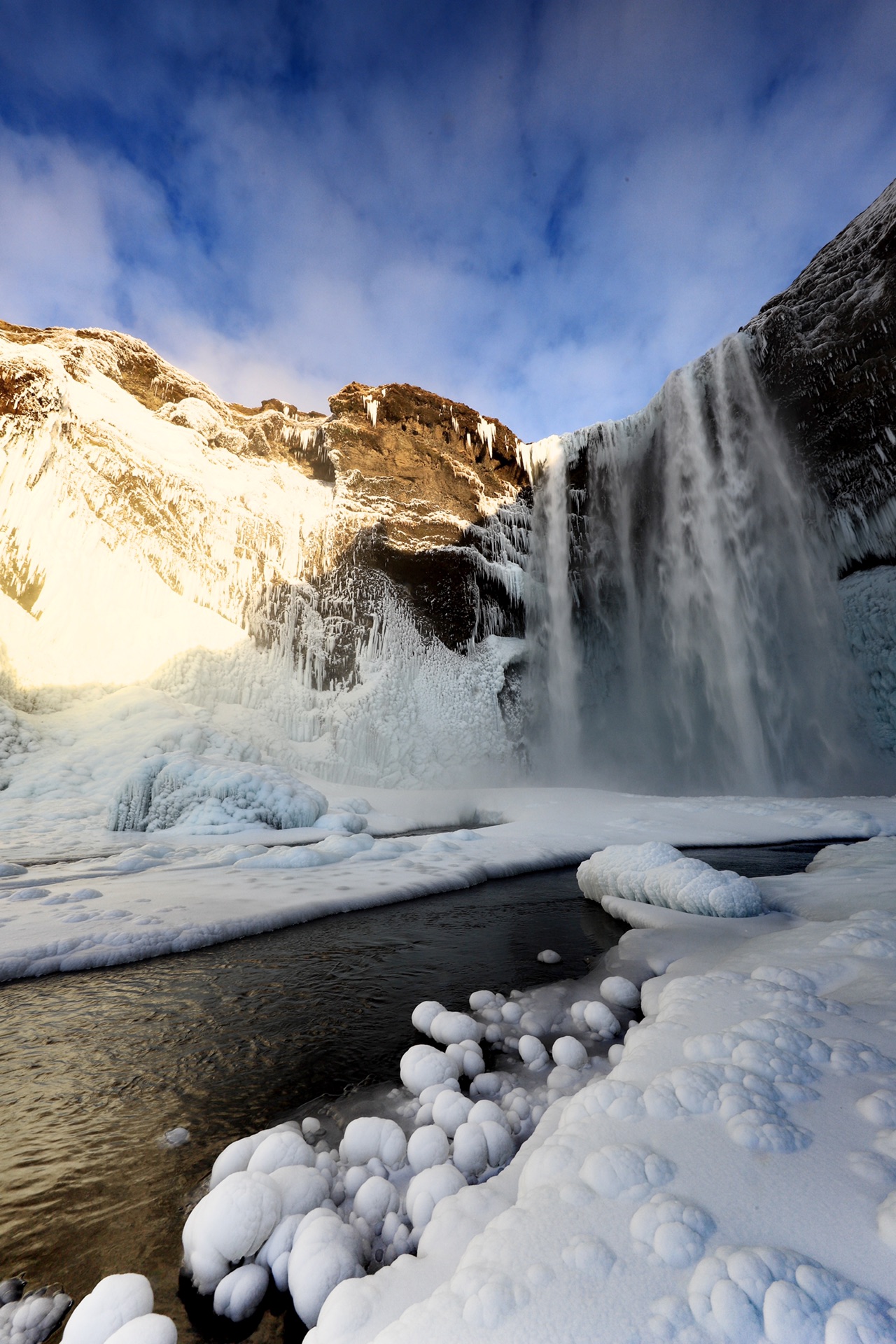 下一站我们到了斯科加瀑布,也称森林瀑布或者彩虹瀑布。瀑布旁边有几百个台阶爬上去,据说上面视角很好。作为一个懒癌晚期人,平时走5分钟都觉得累,爬上去看瀑布这种事我肯定不干。我坚决留在下面拍照了。老闺蜜决定要爬上去体验一下“会当凌绝顶”的感觉。于是我们兵分两路,各自出发。结果,我正拍着照,老闺蜜突然在我背后出现了。很显然,她没爬到顶。原来台阶上结冰太多,实在是不好爬。毕竟出来玩耍,安全还是最重要的。此刻又在心中默念一遍:“我夏天要来一次,爬上去瞅瞅上头到底有啥。”斯科加瀑布周围地上的雪早已冻成结实的冰层,却鼓起一个一个小包,很有意思。周围的山上一条条冰楞子,也形成了蔚为壮观的景色。天气晴朗时可以看见彩虹。我们去的时候确实天气很晴朗啊,可是阳光的角度不对,还是没能看到。甚是遗憾。当然也给了我再游冰岛的一个理由。